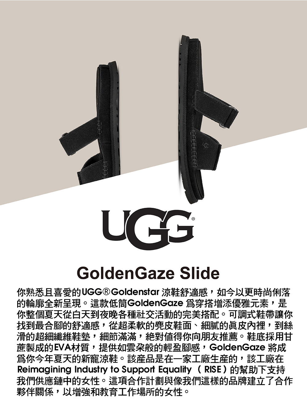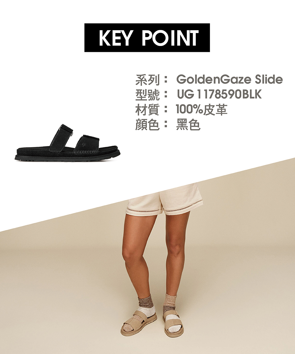你熟悉且喜愛的 UGG® Goldenstar 涼鞋舒適感,如今以更時尚俐落的輪廓全新呈現。這款低筒 GoldenGaze 為穿搭增添優雅元素,是你整個夏天從白天到夜晚各種社交活動的完美搭配。可調式鞋帶讓你找到最合腳的舒適感,從超柔軟的麂皮鞋面、細膩的真皮內裡,到絲滑的超細纖維鞋墊,細節滿滿,絕對值得你向朋友推薦。鞋底採用甘蔗製成的 EVA 材質,提供如雲朵般的輕盈腳感,GoldenGaze 將成為你今年夏天的新寵涼鞋。該產品是在一家工廠生產的,該工廠在 Reimagining Industry to Support Equality (RISE) 的幫助下支持我們供應鏈中的女性。這項合作計劃與像我們這樣的品牌建立了合作夥伴關係,以增強和教育工作場所的女性。