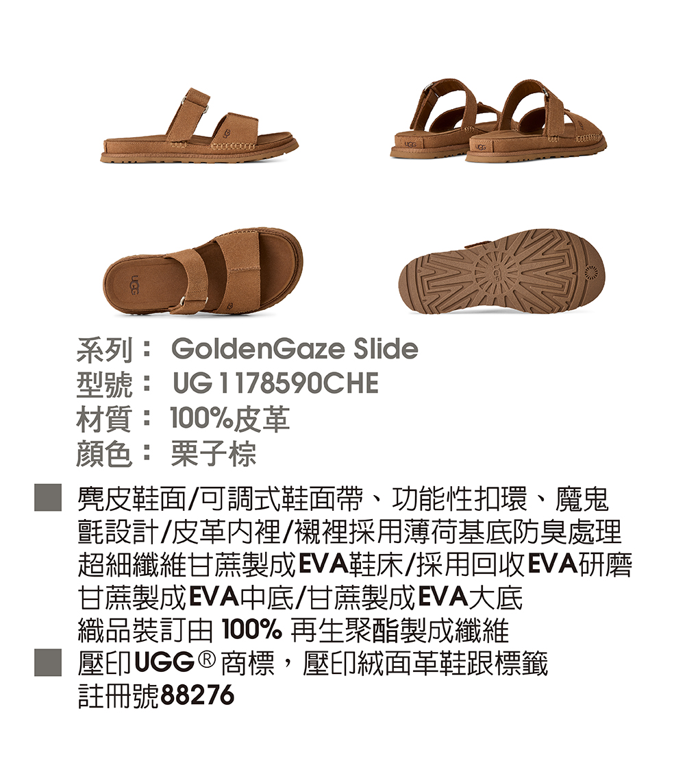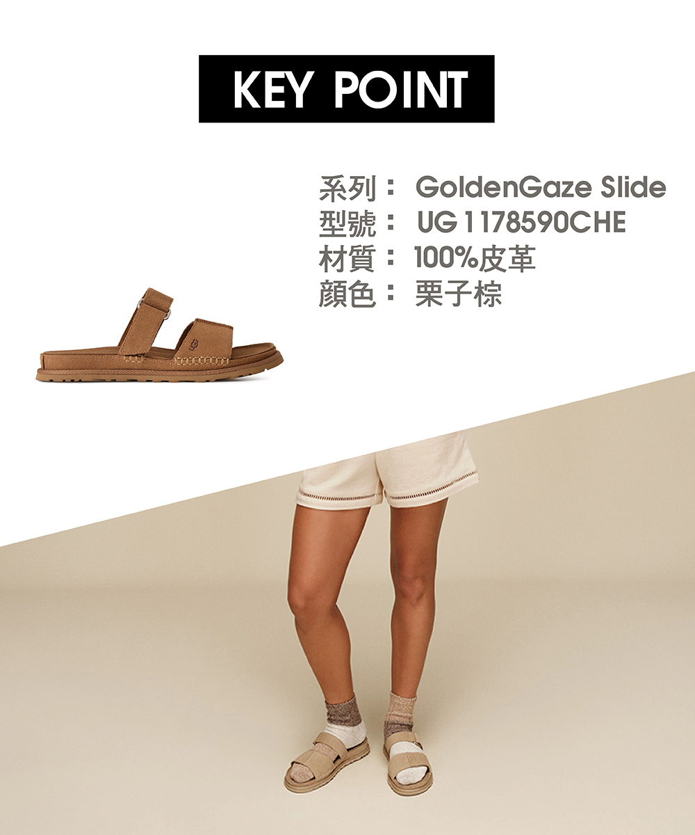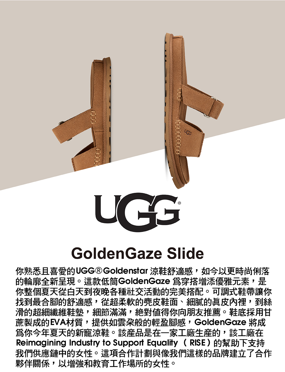 你熟悉且喜愛的 UGG® Goldenstar 涼鞋舒適感,如今以更時尚俐落的輪廓全新呈現。這款低筒 GoldenGaze 為穿搭增添優雅元素,是你整個夏天從白天到夜晚各種社交活動的完美搭配。可調式鞋帶讓你找到最合腳的舒適感,從超柔軟的麂皮鞋面、細膩的真皮內裡,到絲滑的超細纖維鞋墊,細節滿滿,絕對值得你向朋友推薦。鞋底採用甘蔗製成的 EVA 材質,提供如雲朵般的輕盈腳感,GoldenGaze 將成為你今年夏天的新寵涼鞋。該產品是在一家工廠生產的,該工廠在 Reimagining Industry to Support Equality (RISE) 的幫助下支持我們供應鏈中的女性。這項合作計劃與像我們這樣的品牌建立了合作夥伴關係,以增強和教育工作場所的女性。