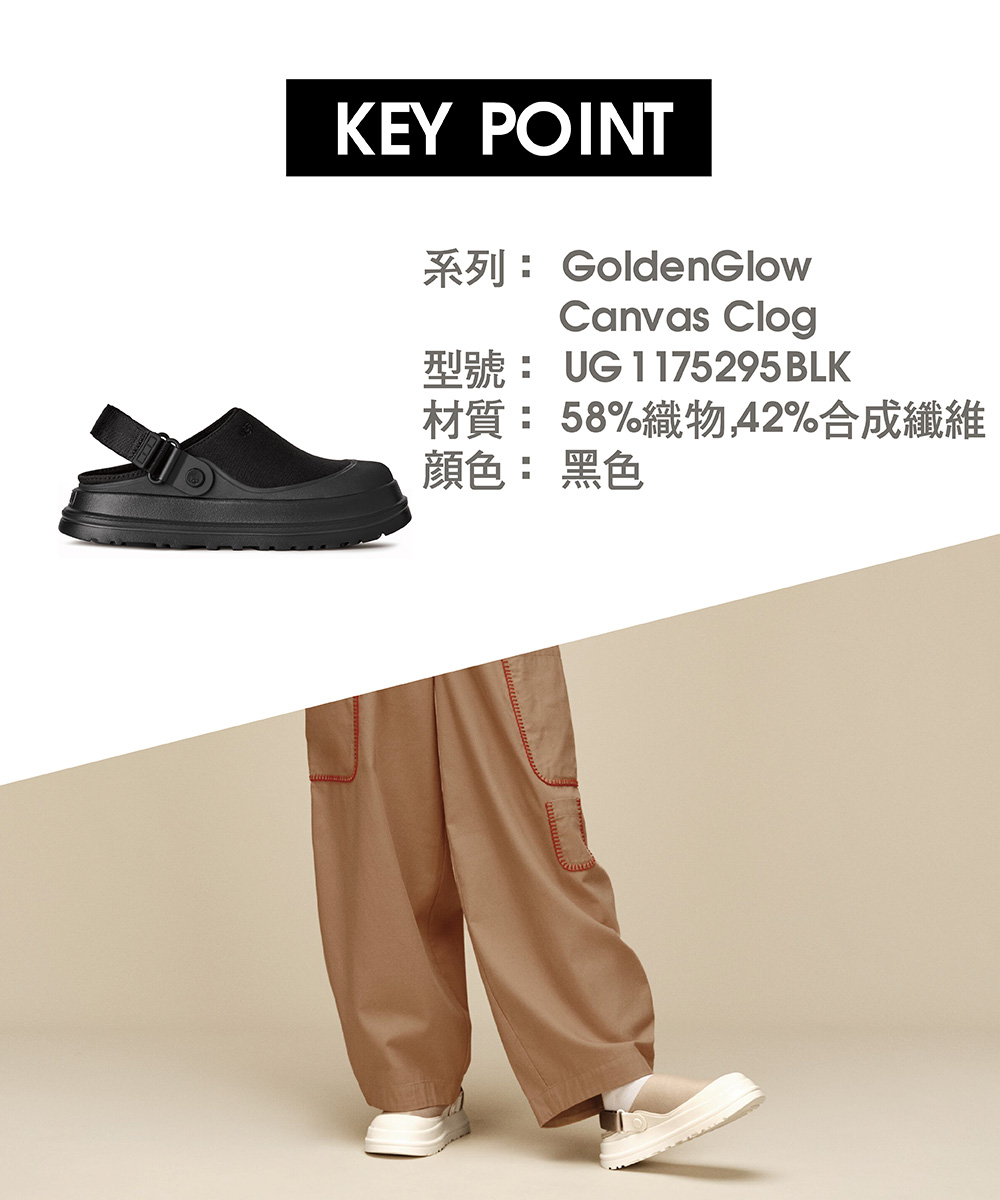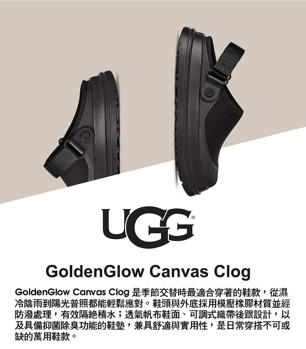 GoldenGlow Canvas Clog 是換季迎向陽光時最該穿的那一雙。成型橡膠鞋頭與外底經過防潑水處理,輕鬆應付地面水漬,透氣帆布鞋面、可調式織帶後跟帶,以及具抗異味功能的鞋墊內裡,集結你日常首選鞋款所需的所有實用機能。