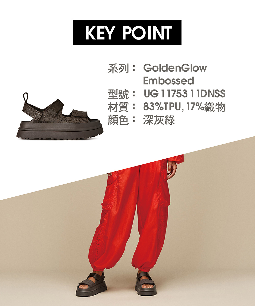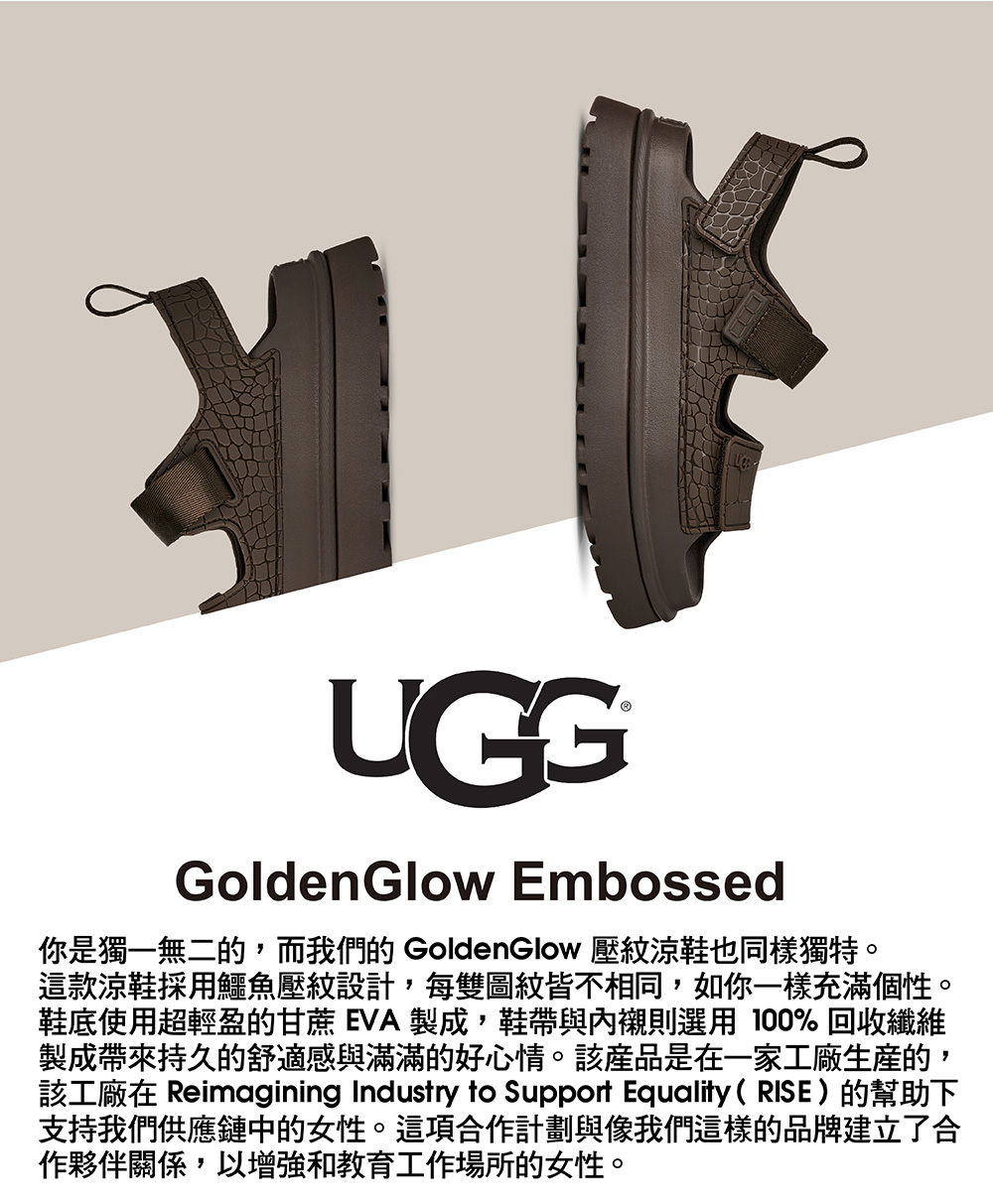 你是獨一無二的,而我們的 GoldenGlow 壓紋涼鞋也同樣獨特。這款涼鞋採用鱷魚壓紋設計,每雙圖紋皆不相同,如你一樣充滿個性。鞋底使用超輕盈的甘蔗 EVA 製成,鞋帶與內襯則選用 100% 回收纖維製成,帶來持久的舒適感與滿滿的好心情。該產品是在一家工廠生產的,該工廠在 Reimagining Industry to Support Equality (RISE) 的幫助下支持我們供應鏈中的女性。這項合作計劃與像我們這樣的品牌建立了合作夥伴關係,以增強和教育工作場所的女性。