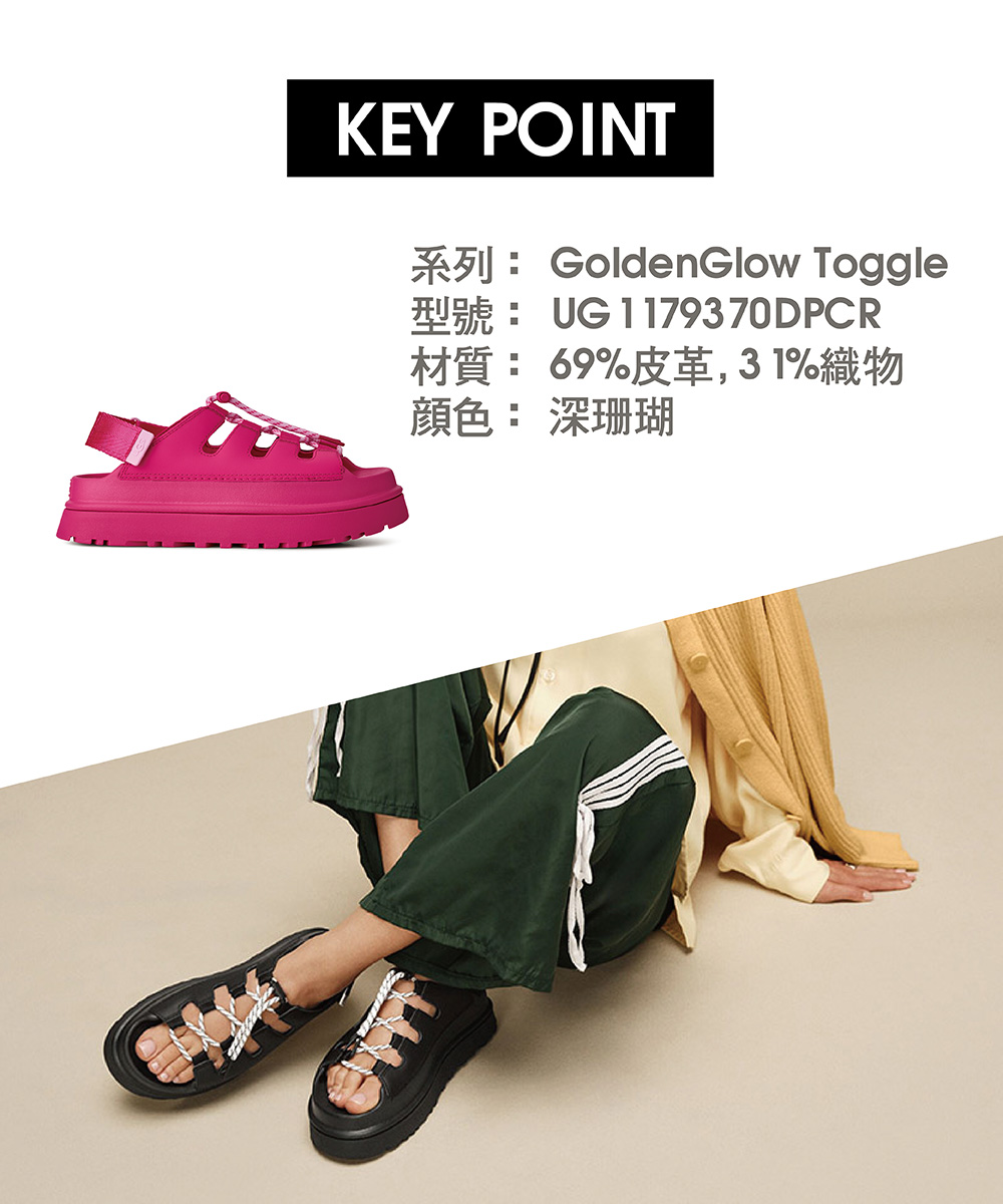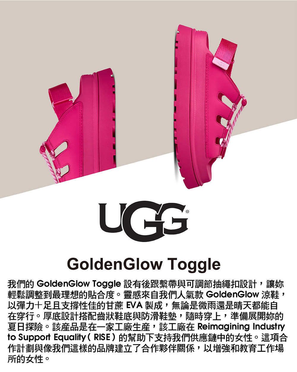 我們的GoldenGlow Toggle 設有後跟繫帶與可調節抽繩扣設計,讓妳輕鬆調整到最理想的貼合度。靈感來自我們人氣款 GoldenGlow 涼鞋,以彈力十足且支撐性佳的甘蔗 EVA 製成,無論是微雨還是晴天都能自在穿行。厚底設計搭配齒狀鞋底與防滑鞋墊,隨時穿上,準備展開妳的夏日探險。該產品是在一家工廠生產的,該工廠在 Reimagining Industry to Support Equality (RISE) 的幫助下支持我們供應鏈中的女性。這項合作計劃與像我們這樣的品牌建立了合作夥伴關係,以增強和教育工作場所的女性。