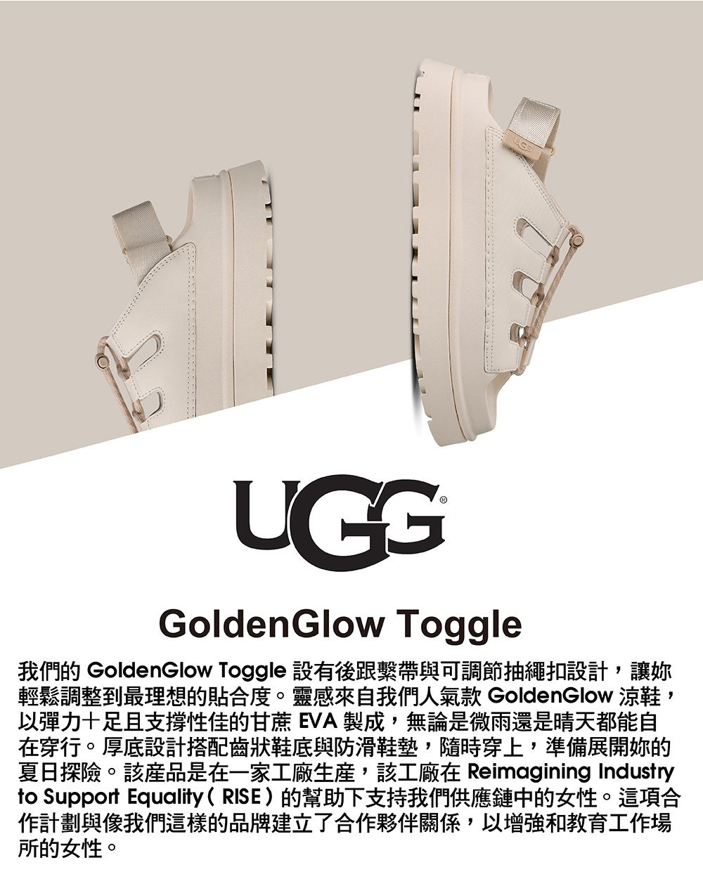 我們的GoldenGlow Toggle 設有後跟繫帶與可調節抽繩扣設計,讓妳輕鬆調整到最理想的貼合度。靈感來自我們人氣款 GoldenGlow 涼鞋,以彈力十足且支撐性佳的甘蔗 EVA 製成,無論是微雨還是晴天都能自在穿行。厚底設計搭配齒狀鞋底與防滑鞋墊,隨時穿上,準備展開妳的夏日探險。該產品是在一家工廠生產的,該工廠在 Reimagining Industry to Support Equality (RISE) 的幫助下支持我們供應鏈中的女性。這項合作計劃與像我們這樣的品牌建立了合作夥伴關係,以增強和教育工作場所的女性。