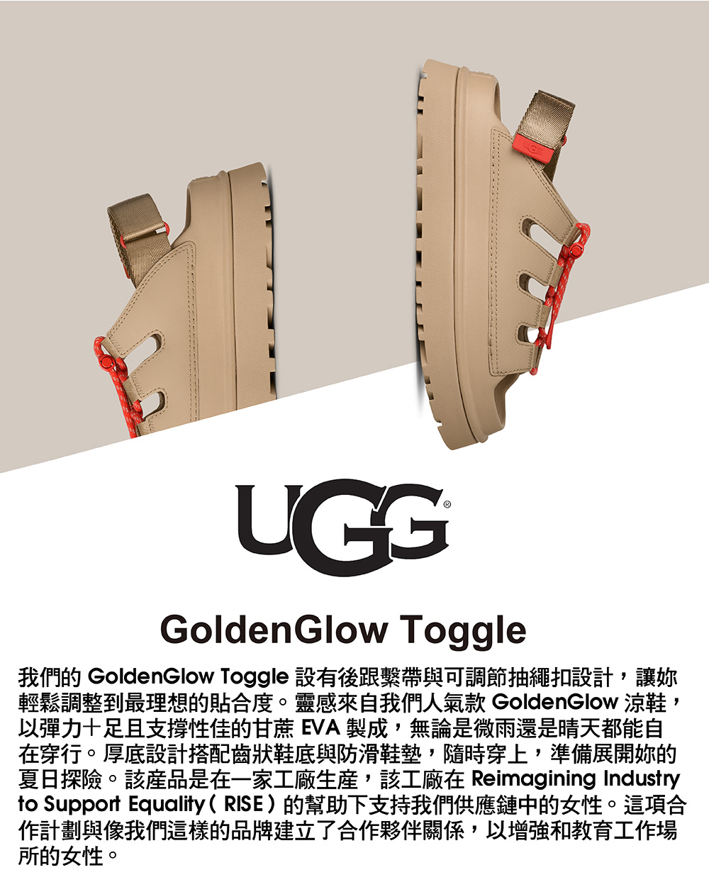 我們的GoldenGlow Toggle 設有後跟繫帶與可調節抽繩扣設計,讓妳輕鬆調整到最理想的貼合度。靈感來自我們人氣款 GoldenGlow 涼鞋,以彈力十足且支撐性佳的甘蔗 EVA 製成,無論是微雨還是晴天都能自在穿行。厚底設計搭配齒狀鞋底與防滑鞋墊,隨時穿上,準備展開妳的夏日探險。該產品是在一家工廠生產的,該工廠在 Reimagining Industry to Support Equality (RISE) 的幫助下支持我們供應鏈中的女性。這項合作計劃與像我們這樣的品牌建立了合作夥伴關係,以增強和教育工作場所的女性。