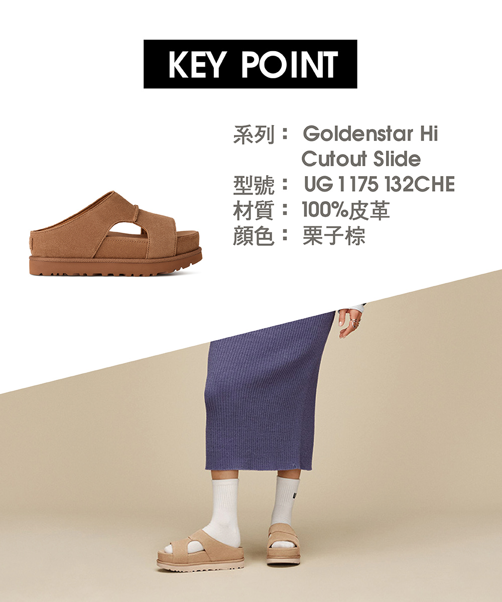 Goldenstar Hi Cutout Slide 這款涼拖鞋源自熱銷的 Goldenstar Hi 涼鞋,現在以更輕鬆的套穿式設計亮相。側邊鏤空剪裁,簡約俐落,帶有建築感的設計語彙,是你夏日造型的完美搭檔。細節也毫不馬虎:選用絨面革打造,搭配柔軟支撐性泡棉鞋墊與輕盈的甘蔗 EVA 大底,全天穿著也依然舒適。加厚的雙縫線細節,為這雙簡約卻獨特的拖鞋增添不凡質感。