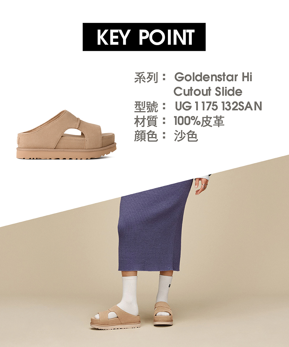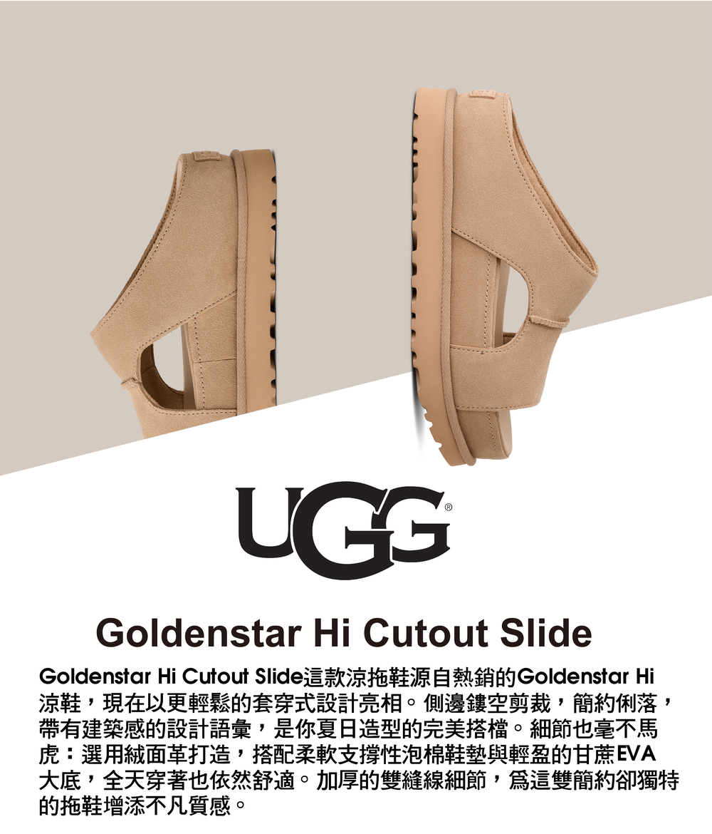 Goldenstar Hi Cutout Slide 這款涼拖鞋源自熱銷的 Goldenstar Hi 涼鞋,現在以更輕鬆的套穿式設計亮相。側邊鏤空剪裁,簡約俐落,帶有建築感的設計語彙,是你夏日造型的完美搭檔。細節也毫不馬虎:選用絨面革打造,搭配柔軟支撐性泡棉鞋墊與輕盈的甘蔗 EVA 大底,全天穿著也依然舒適。加厚的雙縫線細節,為這雙簡約卻獨特的拖鞋增添不凡質感。