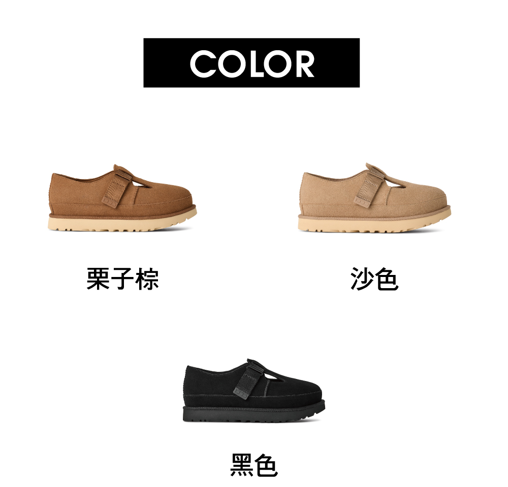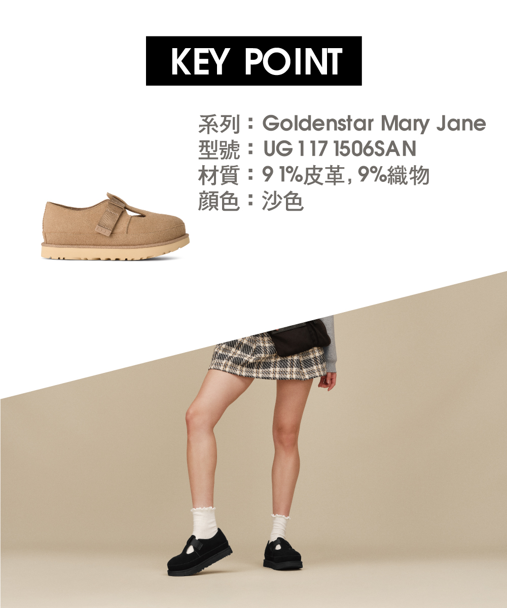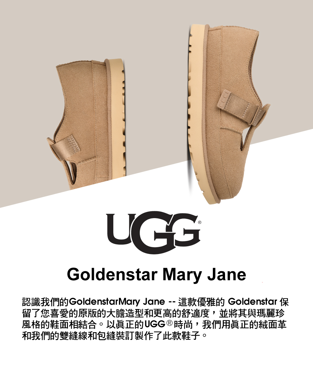 認識我們的GoldenstarMary Jane -- 這款優雅的 Goldenstar 保留了您喜愛的原版的大膽造型和更高的舒適度,並將其與瑪麗珍風格的鞋面相結合。以真正的UGG®時尚,我們用真正的絨面革和我們的雙縫線和包縫裝訂製作了此款鞋子。