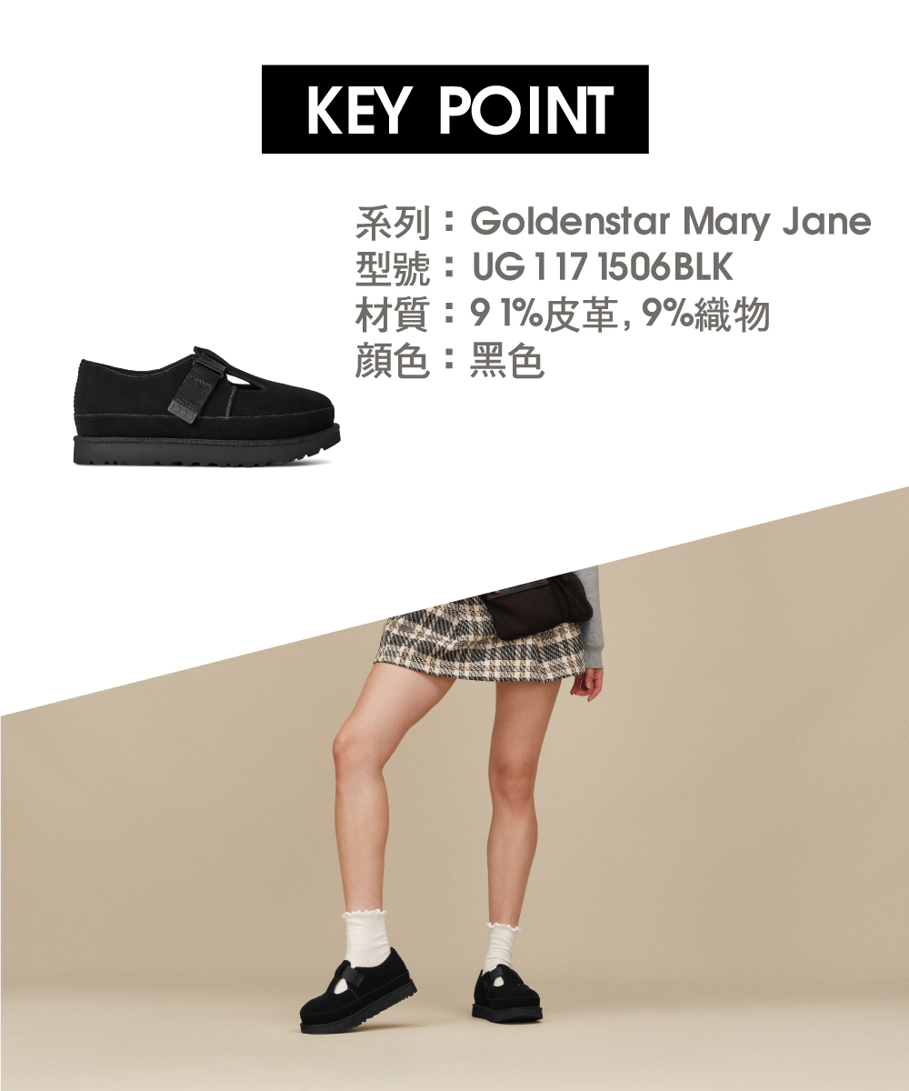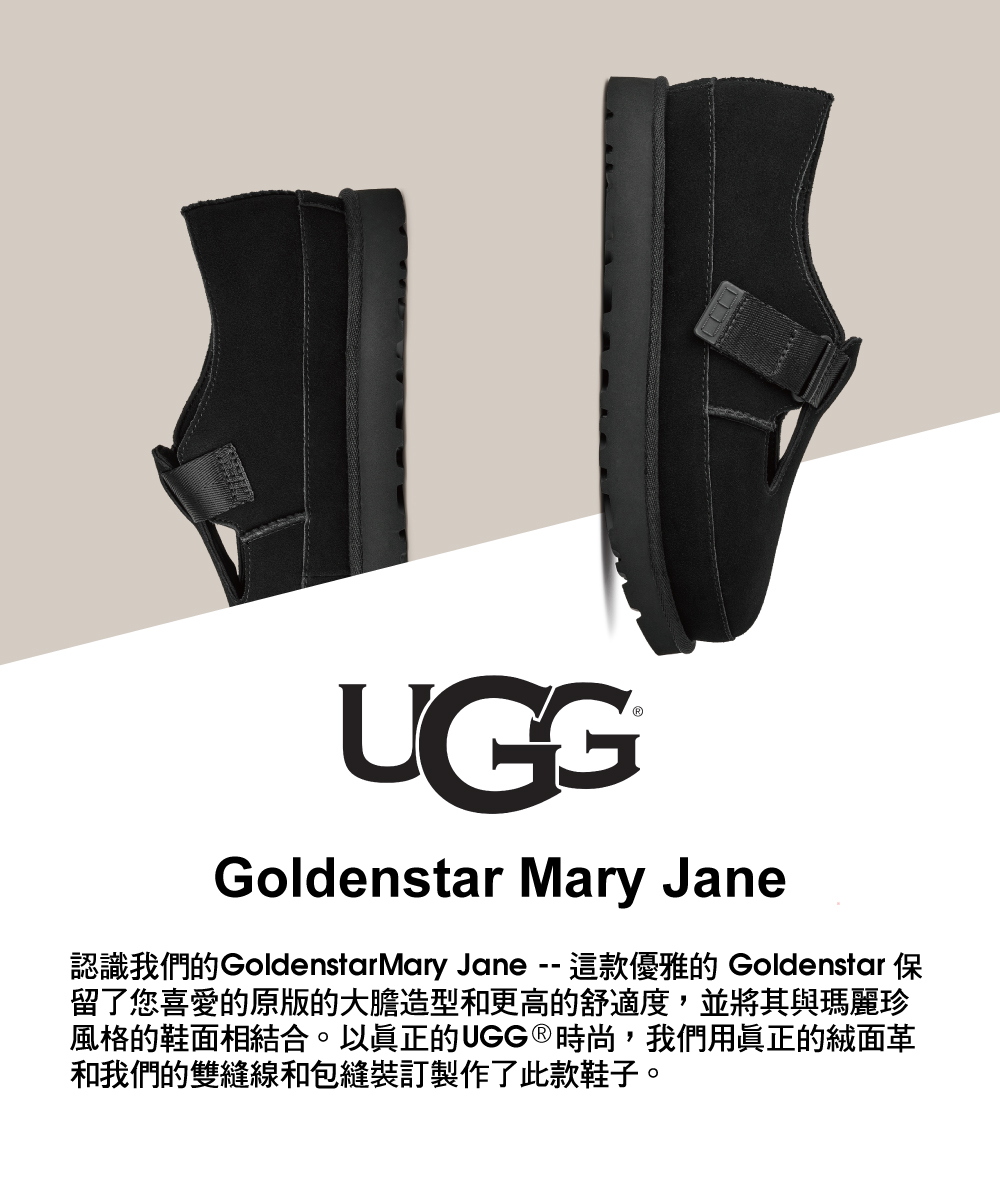 認識我們的GoldenstarMary Jane -- 這款優雅的 Goldenstar 保留了您喜愛的原版的大膽造型和更高的舒適度,並將其與瑪麗珍風格的鞋面相結合。以真正的UGG®時尚,我們用真正的絨面革和我們的雙縫線和包縫裝訂製作了此款鞋子。