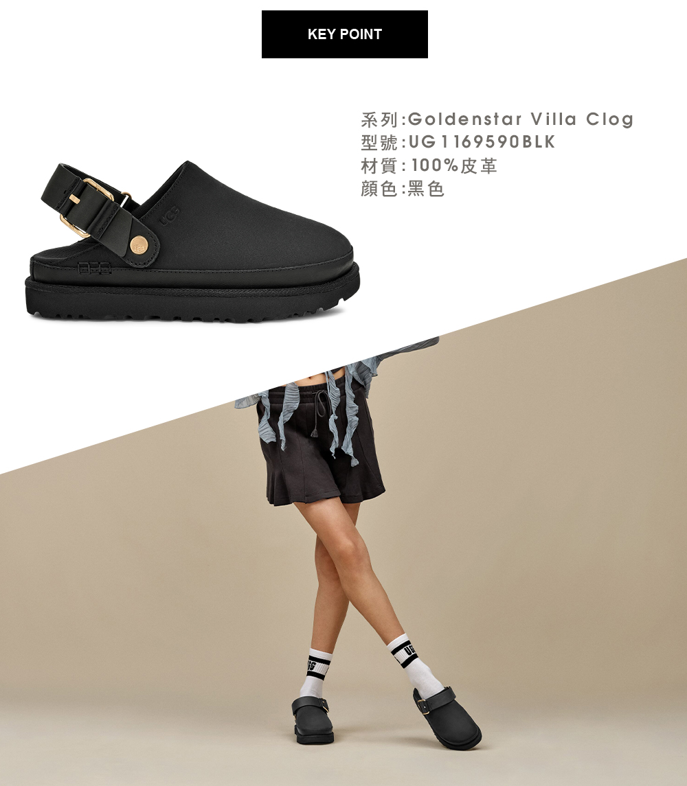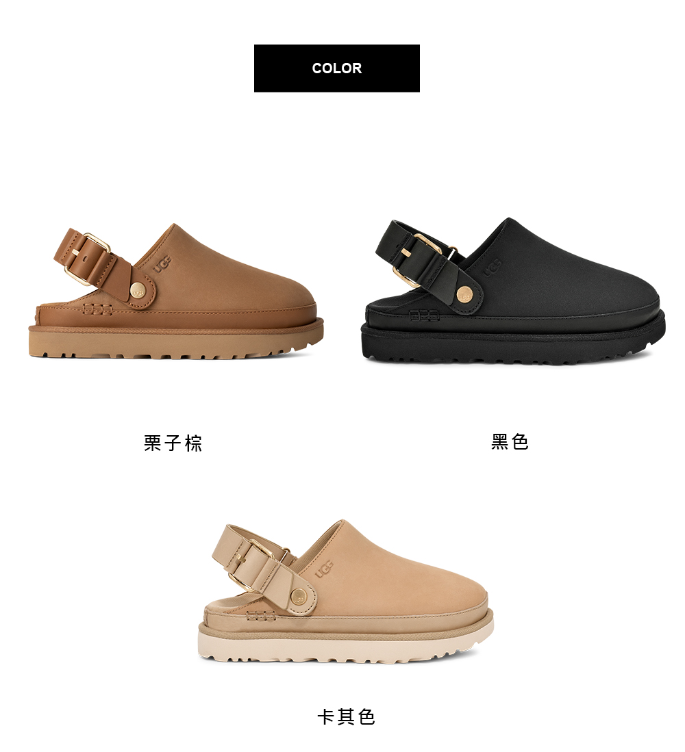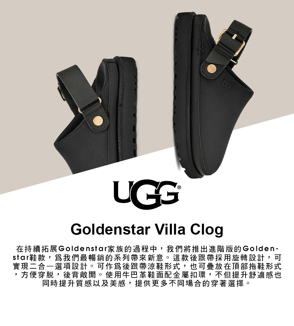 • UGG®商標可調式皮革後跟帶配金屬扣環