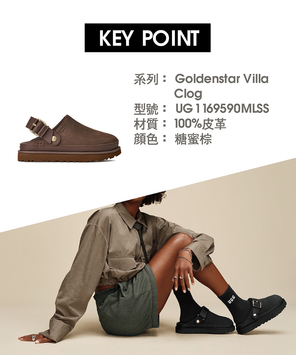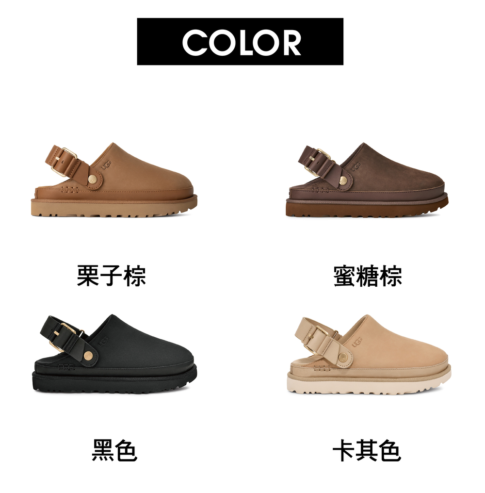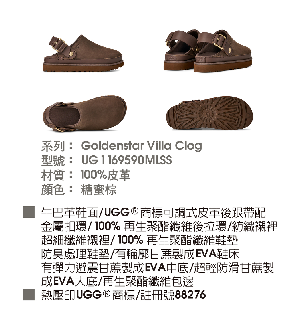 - UGG®商標可調式皮革後跟帶配金屬扣環