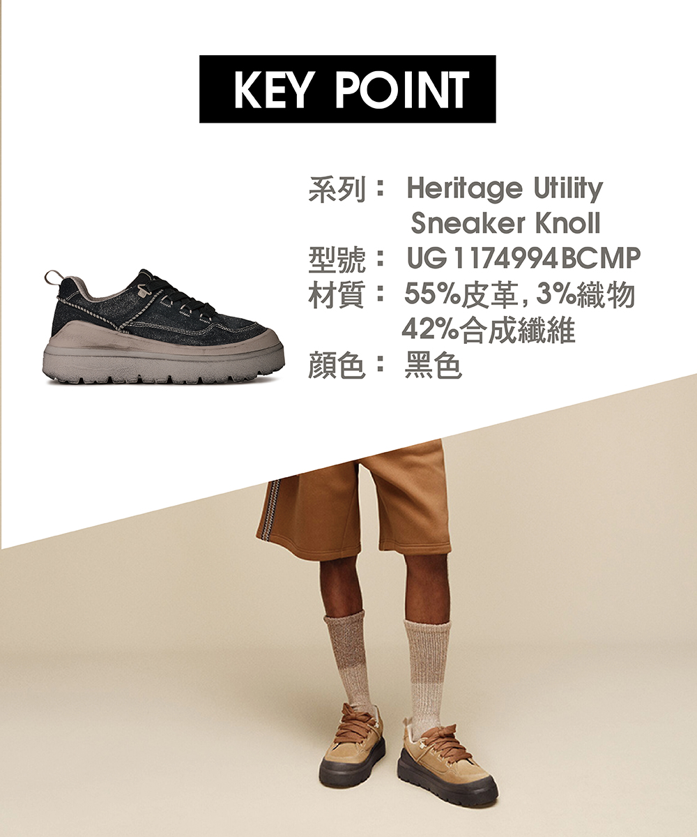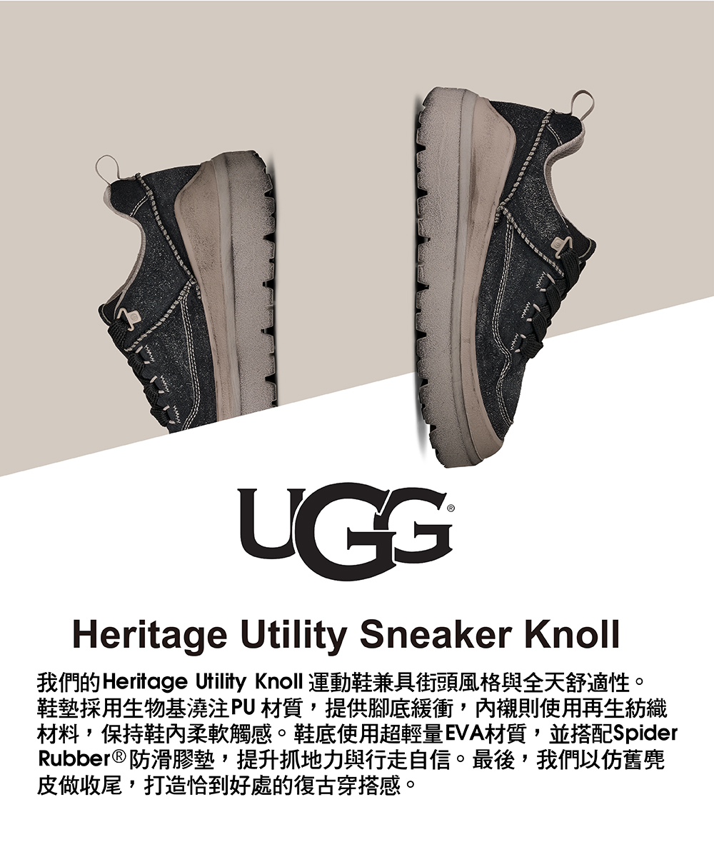 我們的 Heritage Utility Knoll 運動鞋兼具街頭風格與全天舒適性。鞋墊採用生物基澆注 PU 材質,提供腳底緩衝,內襯則使用再生紡織材料,保持鞋內柔軟觸感。鞋底使用超輕量 EVA 材質,並搭配 Spider Rubber® 防滑膠墊,提升抓地力與行走自信。最後,我們以仿舊麂皮做收尾,打造恰到好處的復古穿搭感。