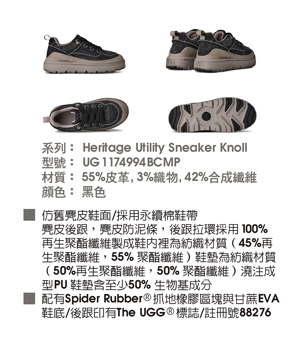 - 麂皮後跟、麂皮防泥條,後跟拉環採用 100% 再生聚酯纖維製成