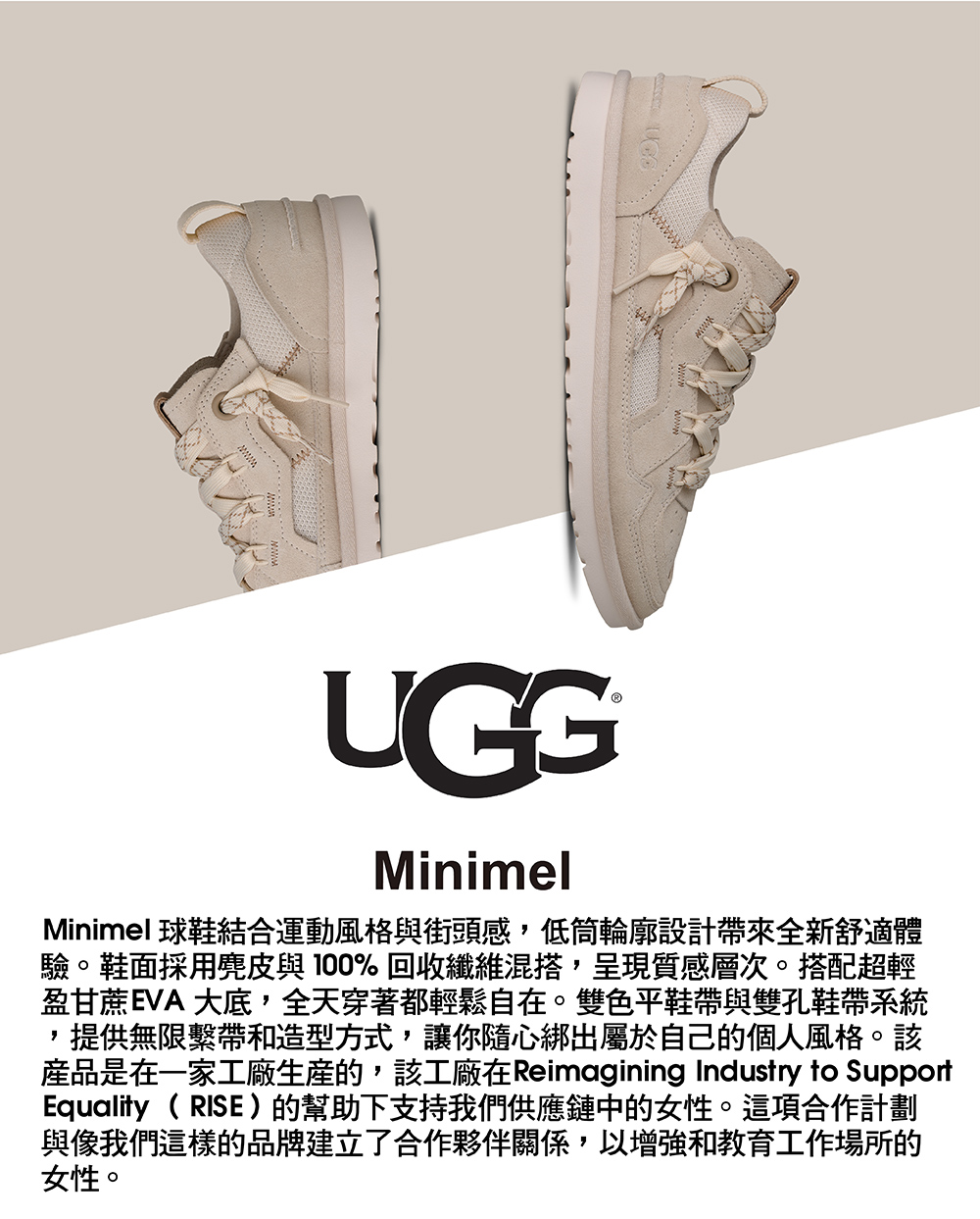 Minimel 球鞋結合運動風格與街頭感,低筒輪廓設計帶來全新舒適體驗。鞋面採用麂皮與 100% 回收纖維混搭,呈現質感層次。搭配超輕盈甘蔗 EVA 大底,全天穿著都輕鬆自在。雙色平鞋帶與雙孔鞋帶系統,提供無限繫帶和造型方式,讓你隨心綁出屬於自己的個人風格。該產品是在一家工廠生產的,該工廠在 Reimagining Industry to Support Equality (RISE) 的幫助下支持我們供應鏈中的女性。這項合作計劃與像我們這樣的品牌建立了合作夥伴關係,以增強和教育工作場所的女性。Minimel為男女對鞋款。