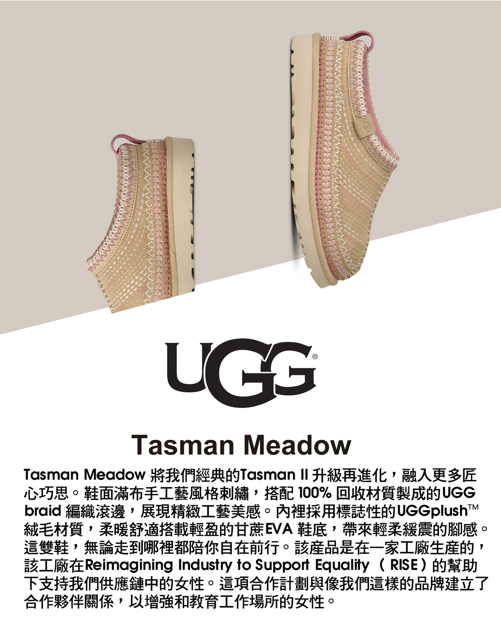 Tasman Meadow 將我們經典的 Tasman II 升級再進化,融入更多匠心巧思。鞋面滿布手工藝風格刺繡,搭配 100% 回收材質製成的 UGGbraid 編織滾邊,展現精緻工藝美感。內裡採用標誌性的 UGGplush™ 絨毛材質,柔暖舒適;搭載輕盈的甘蔗 EVA 鞋底,帶來輕柔緩震的腳感。這雙鞋,無論走到哪裡都陪你自在前行。該產品是在一家工廠生產的,該工廠在 Reimagining Industry to Support Equality (RISE) 的幫助下支持我們供應鏈中的女性。這項合作計劃與像我們這樣的品牌建立了合作夥伴關係,以增強和教育工作場所的女性。