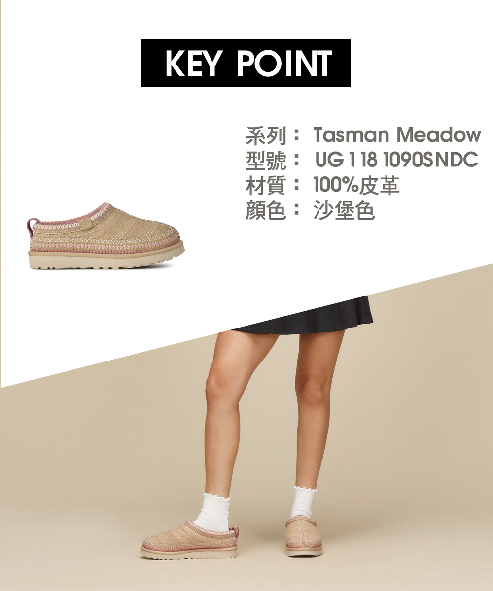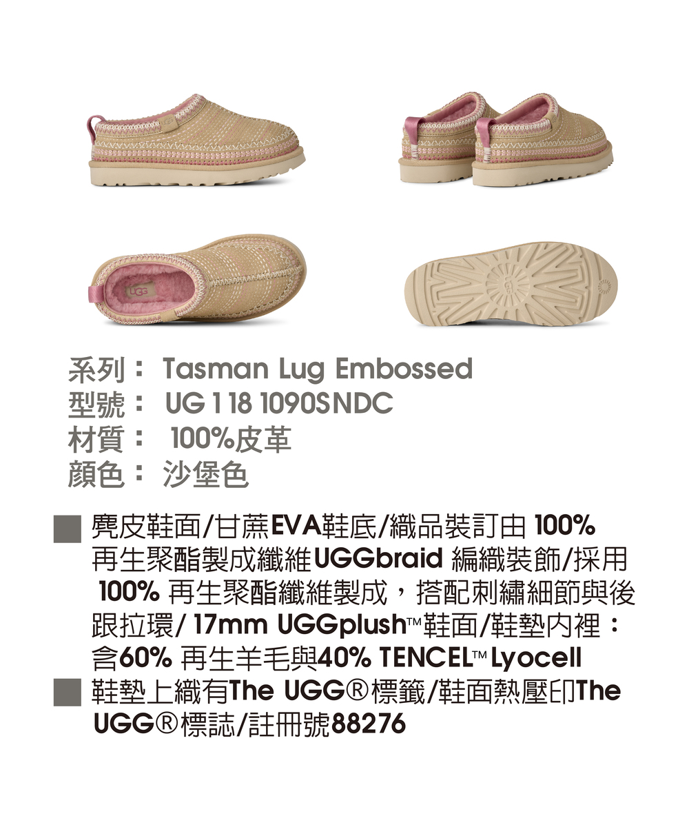 - UGGbraid 編織裝飾,採用 100% 再生聚酯纖維製成,搭配刺繡細節與後跟拉環