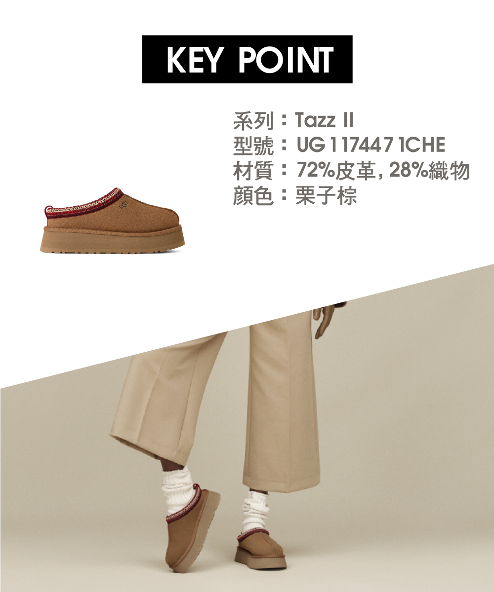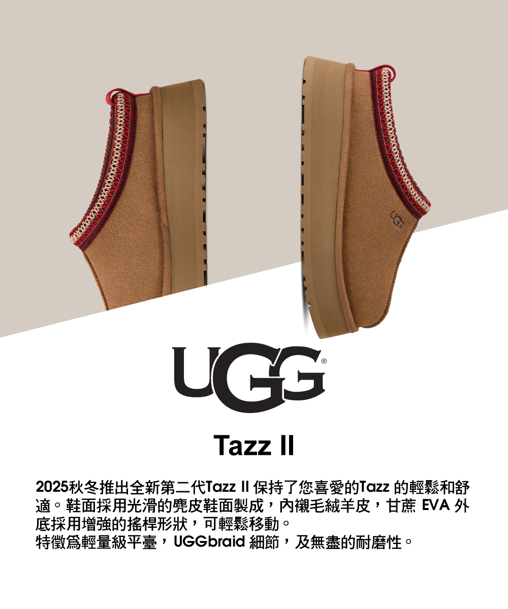 2025秋冬推出全新第二代Tazz II 保持了您喜愛的Tazz 的輕鬆和舒適。鞋面採用光滑的麂皮鞋面製成,內襯毛絨羊皮,甘蔗 EVA 外底採用增強的搖桿形狀,可輕鬆移動。特徵為輕量級平臺,UGGbraid 細節,及無盡的耐磨性。