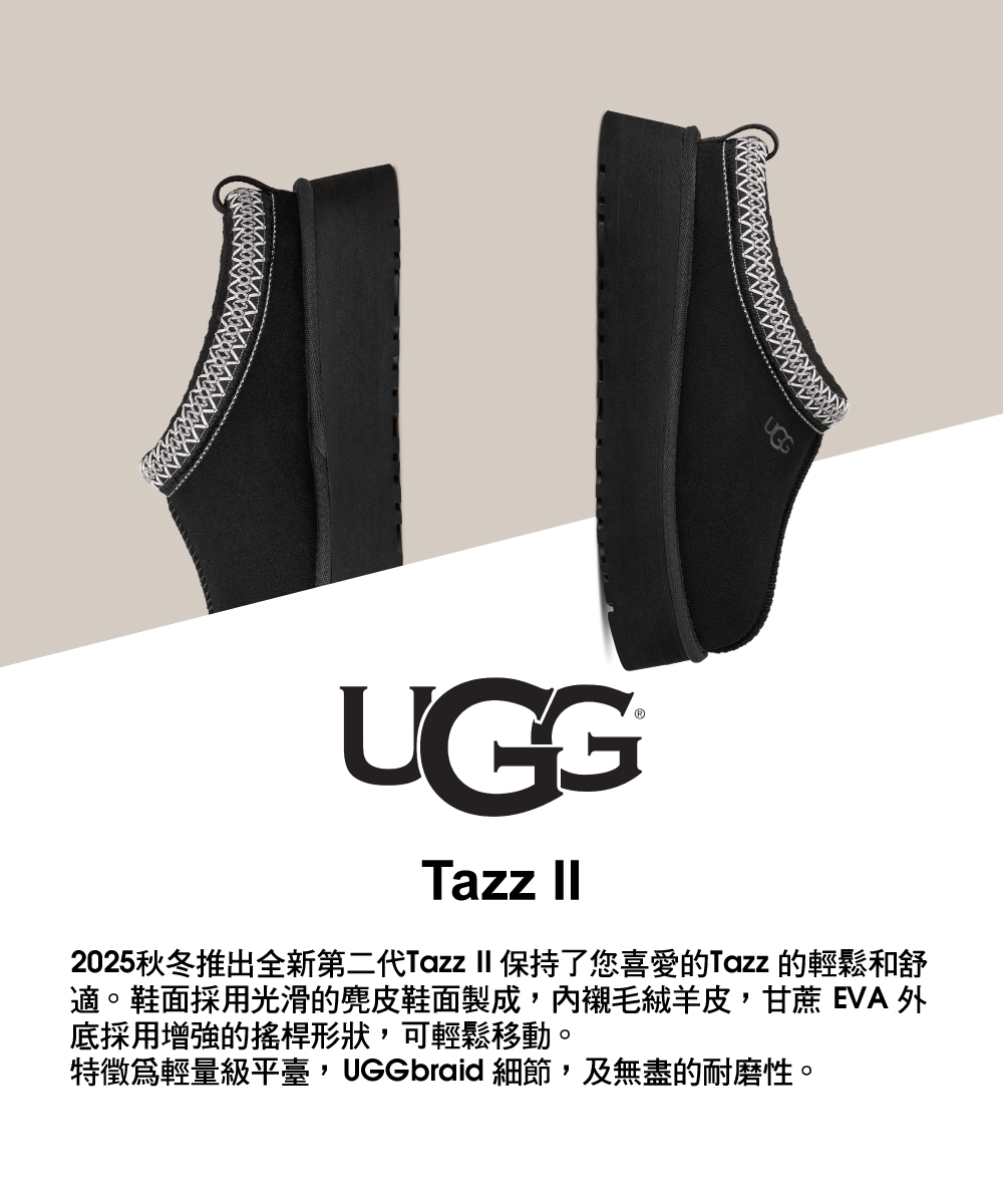 2025秋冬推出全新第二代Tazz II 保持了您喜愛的Tazz 的輕鬆和舒適。鞋面採用光滑的麂皮鞋面製成,內襯毛絨羊皮,甘蔗 EVA 外底採用增強的搖桿形狀,可輕鬆移動。特徵為輕量級平臺,UGGbraid 細節,及無盡的耐磨性。