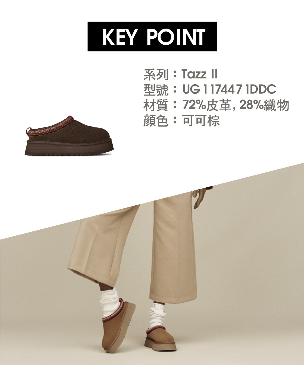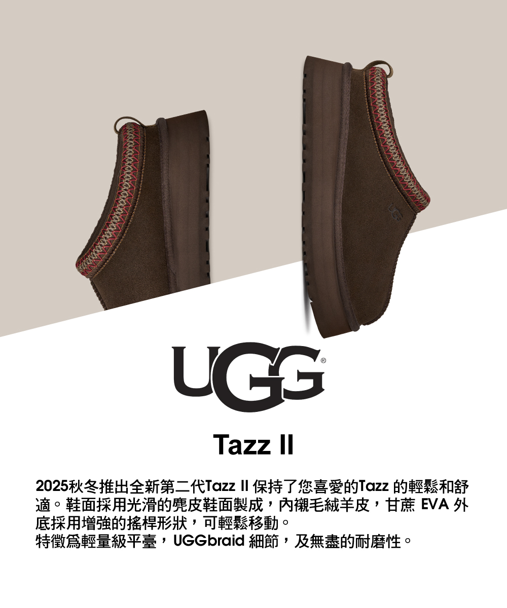 2025秋冬推出全新第二代Tazz II 保持了您喜愛的Tazz 的輕鬆和舒適。鞋面採用光滑的麂皮鞋面製成,內襯毛絨羊皮,甘蔗 EVA 外底採用增強的搖桿形狀,可輕鬆移動。特徵為輕量級平臺,UGGbraid 細節,及無盡的耐磨性。