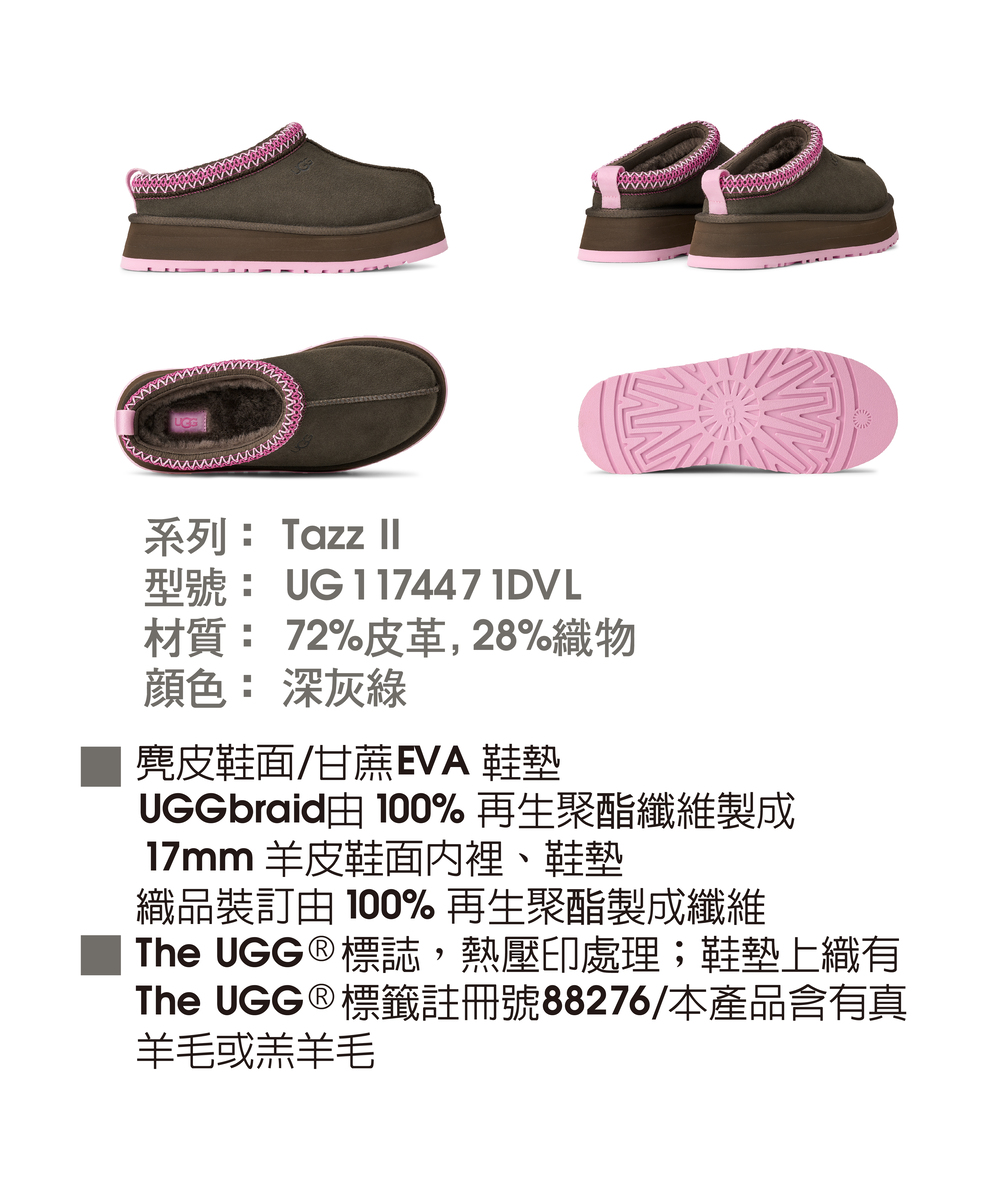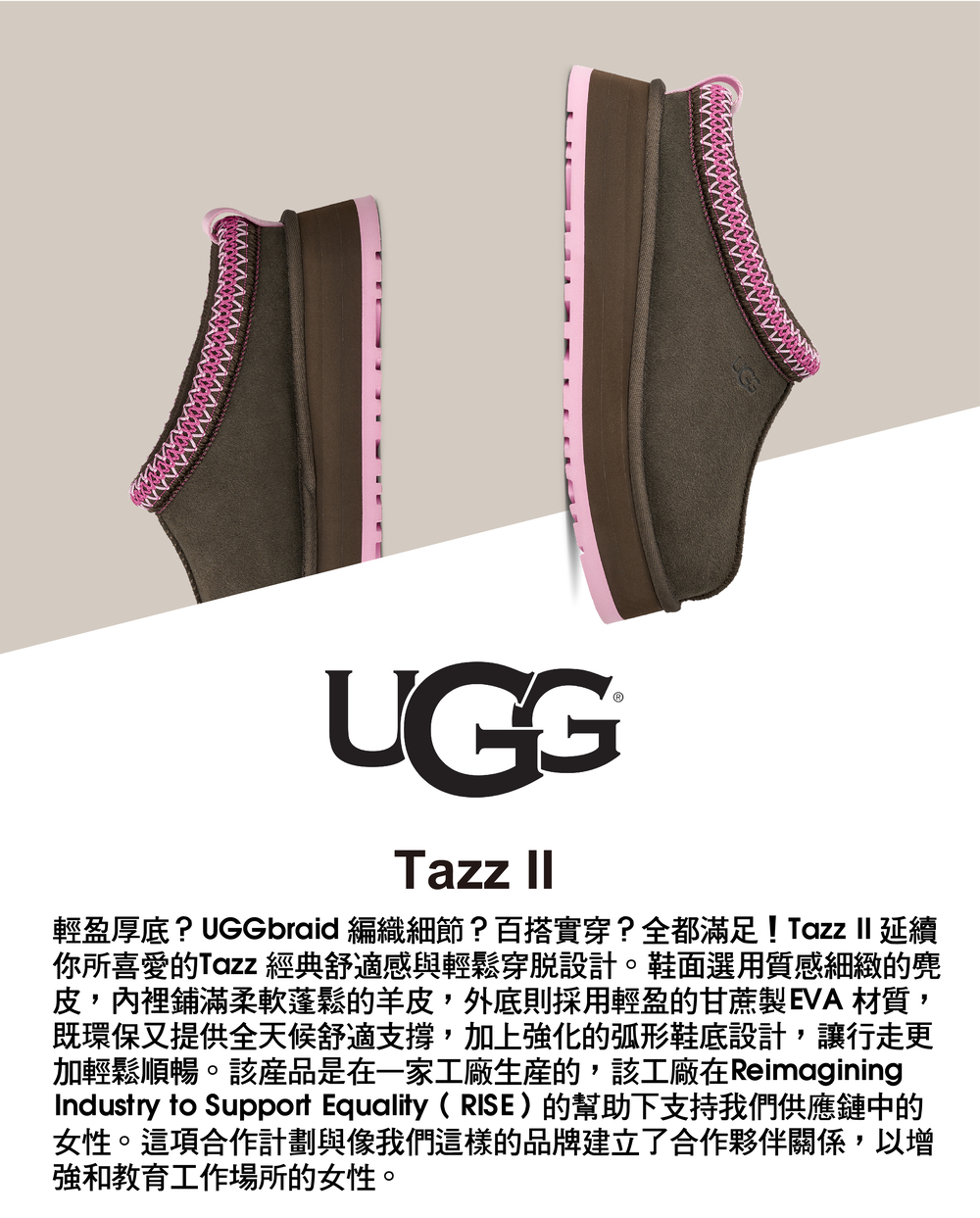 輕盈厚底?UGGbraid 編織細節?百搭實穿?全都滿足!Tazz II 延續你所喜愛的 Tazz 經典舒適感與輕鬆穿脫設計。鞋面選用質感細緻的麂皮,內裡鋪滿柔軟蓬鬆的羊皮,外底則採用輕盈的甘蔗製 EVA 材質,既環保又提供全天候舒適支撐,加上強化的弧形鞋底設計,讓行走更加輕鬆順暢。該產品是在一家工廠生產的,該工廠在 Reimagining Industry to Support Equality (RISE) 的幫助下支持我們供應鏈中的女性。這項合作計劃與像我們這樣的品牌建立了合作夥伴關係,以增強和教育工作場所的女性。