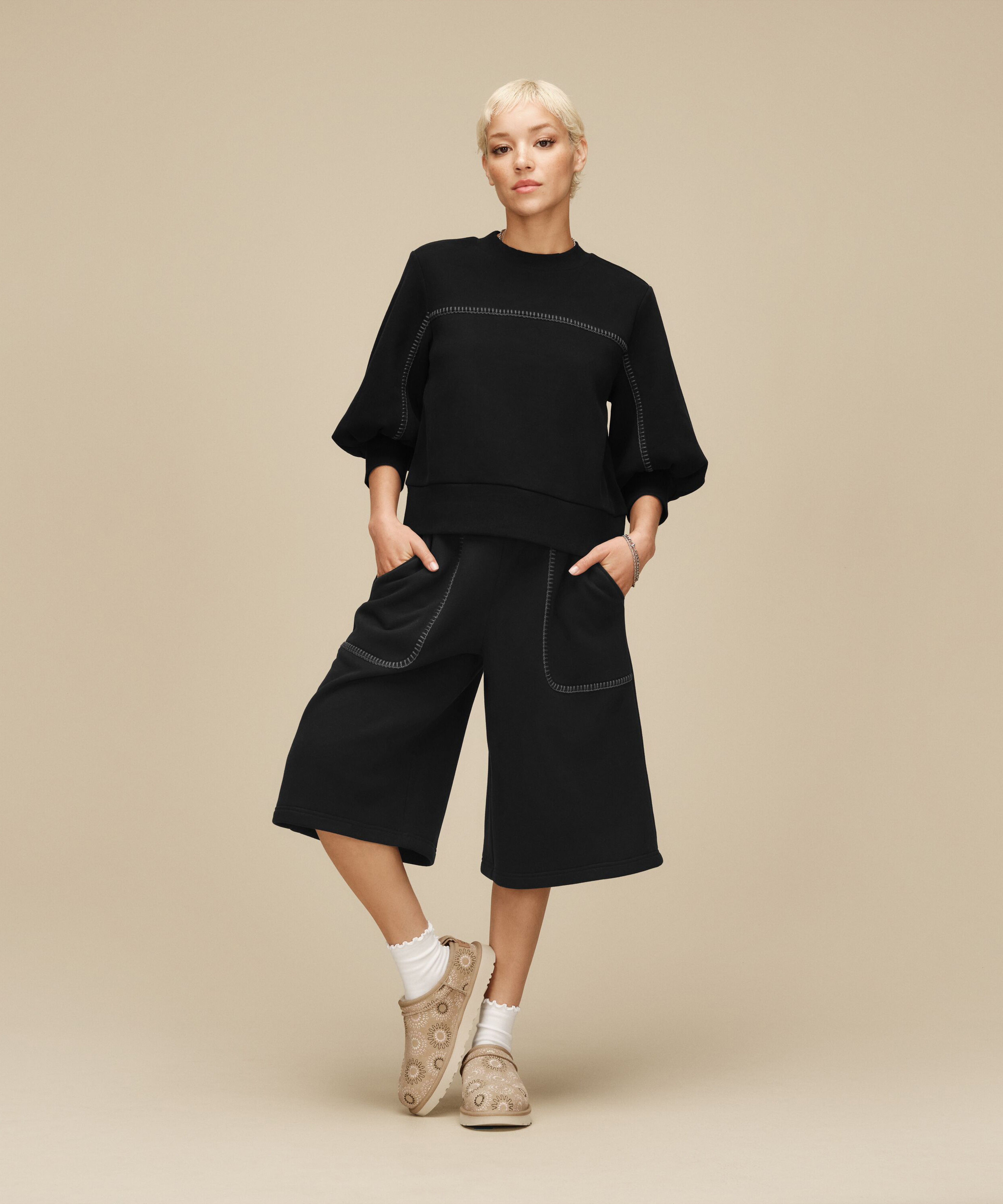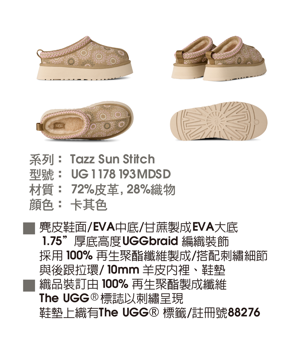 - UGGbraid 編織裝飾,採用 100% 再生聚酯纖維製成,搭配刺繡細節與後跟拉環