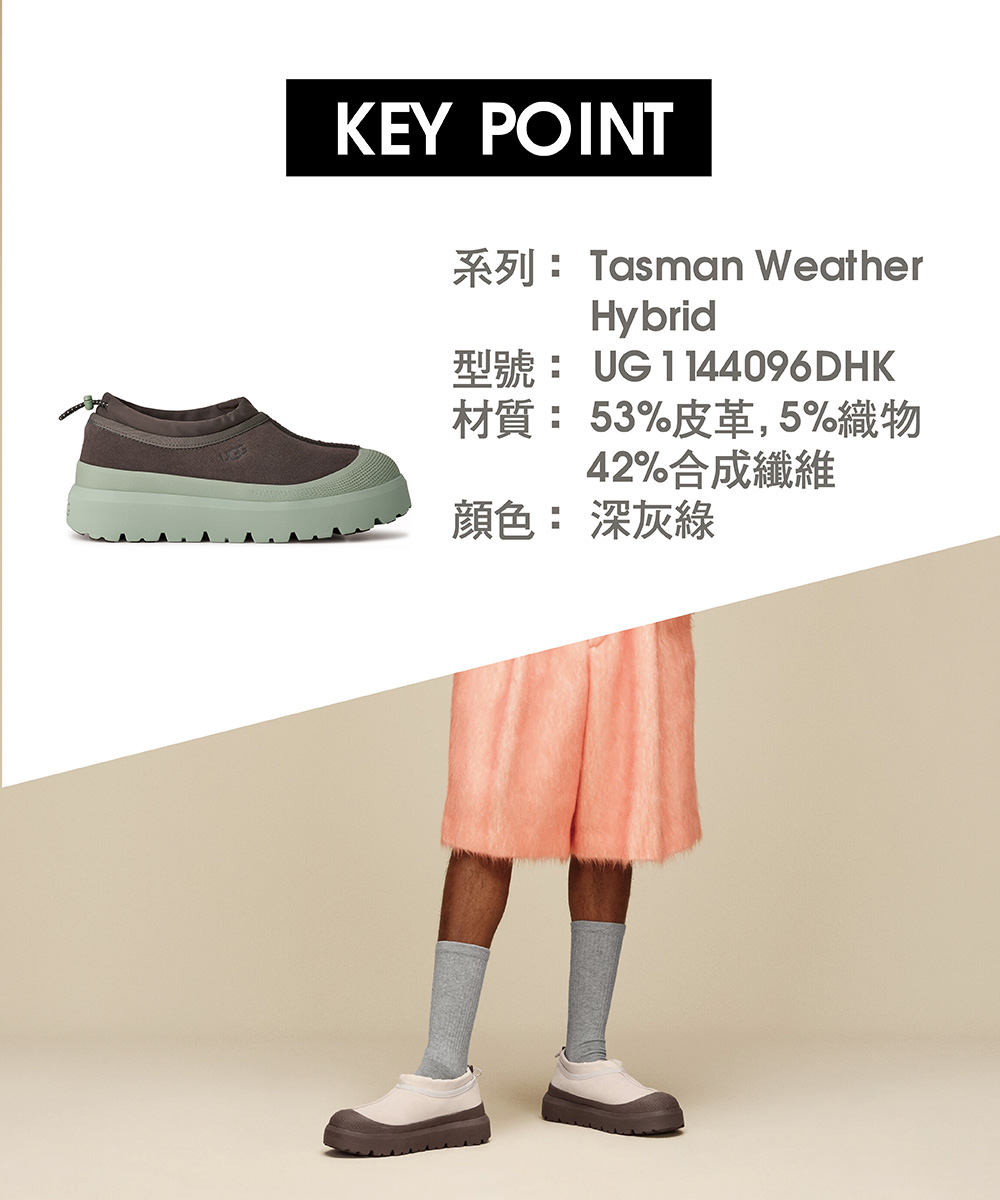 我們總是可以依靠 Tasman Weather Hybrid 陪我們走到戶外,就算外面有點濕也沒關係。這款鞋採用防潑水麂皮與密封接縫設計,加上我們舒適的 UGGplush™ 再生羊毛內裡,提供輕盈、宛如拖鞋般的穿著感,以及方便穿脫的套穿式輪廓。鞋底則由可再生、以雨水灌溉的甘蔗製成,並配有一體成型的防潑水鞋套,專為濕滑天氣打造。