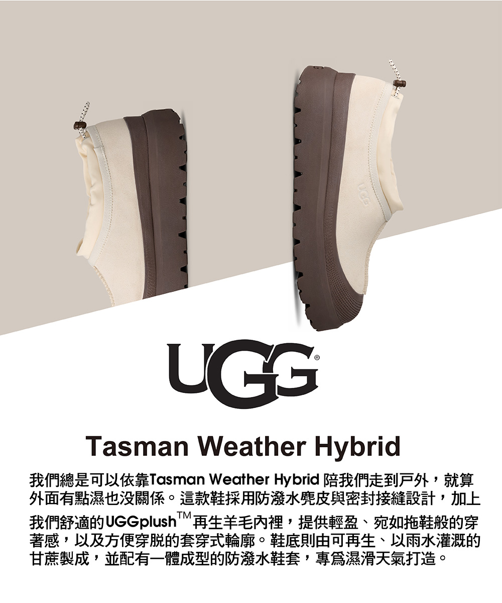我們總是可以依靠 Tasman Weather Hybrid 陪我們走到戶外,就算外面有點濕也沒關係。這款鞋採用防潑水麂皮與密封接縫設計,加上我們舒適的 UGGplush™ 再生羊毛內裡,提供輕盈、宛如拖鞋般的穿著感,以及方便穿脫的套穿式輪廓。鞋底則由可再生、以雨水灌溉的甘蔗製成,並配有一體成型的防潑水鞋套,專為濕滑天氣打造。