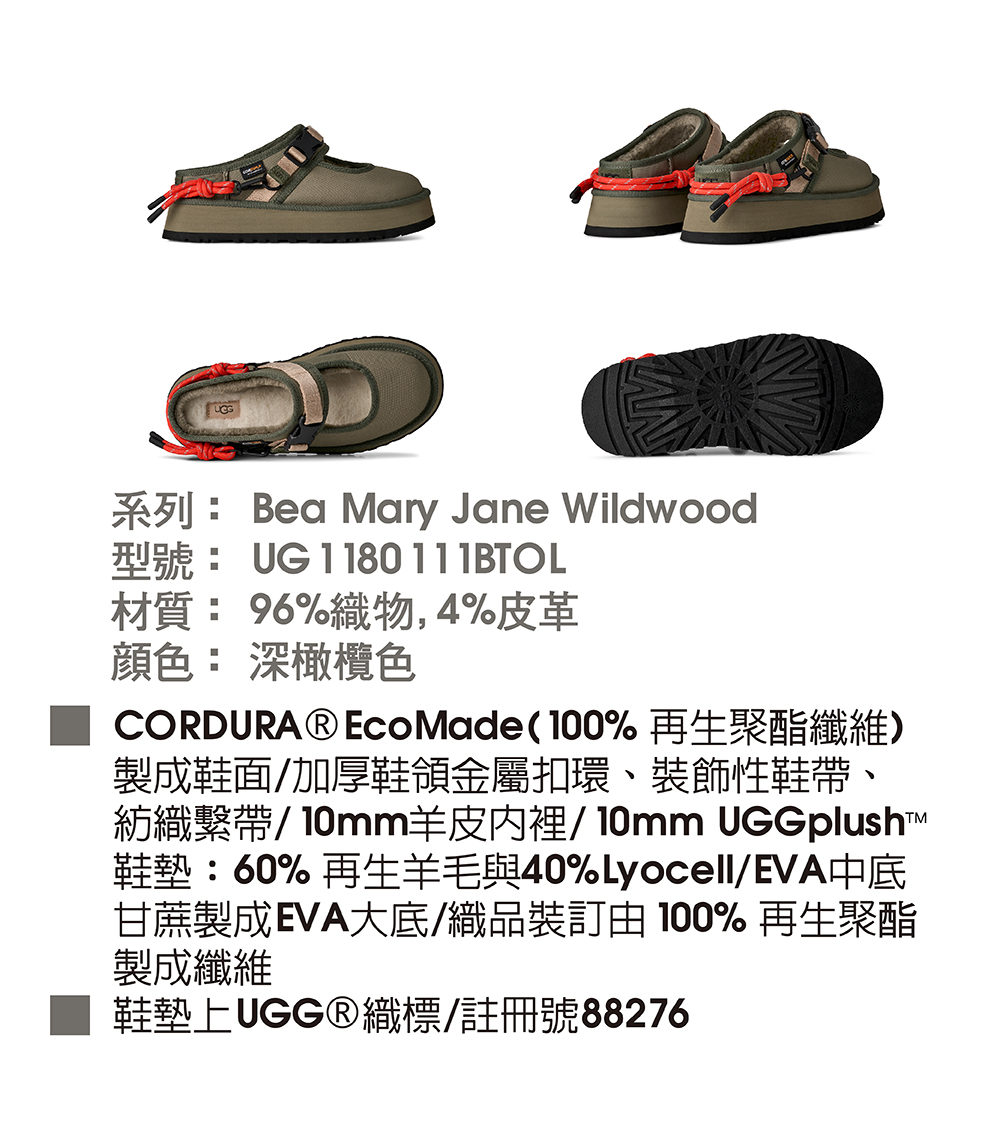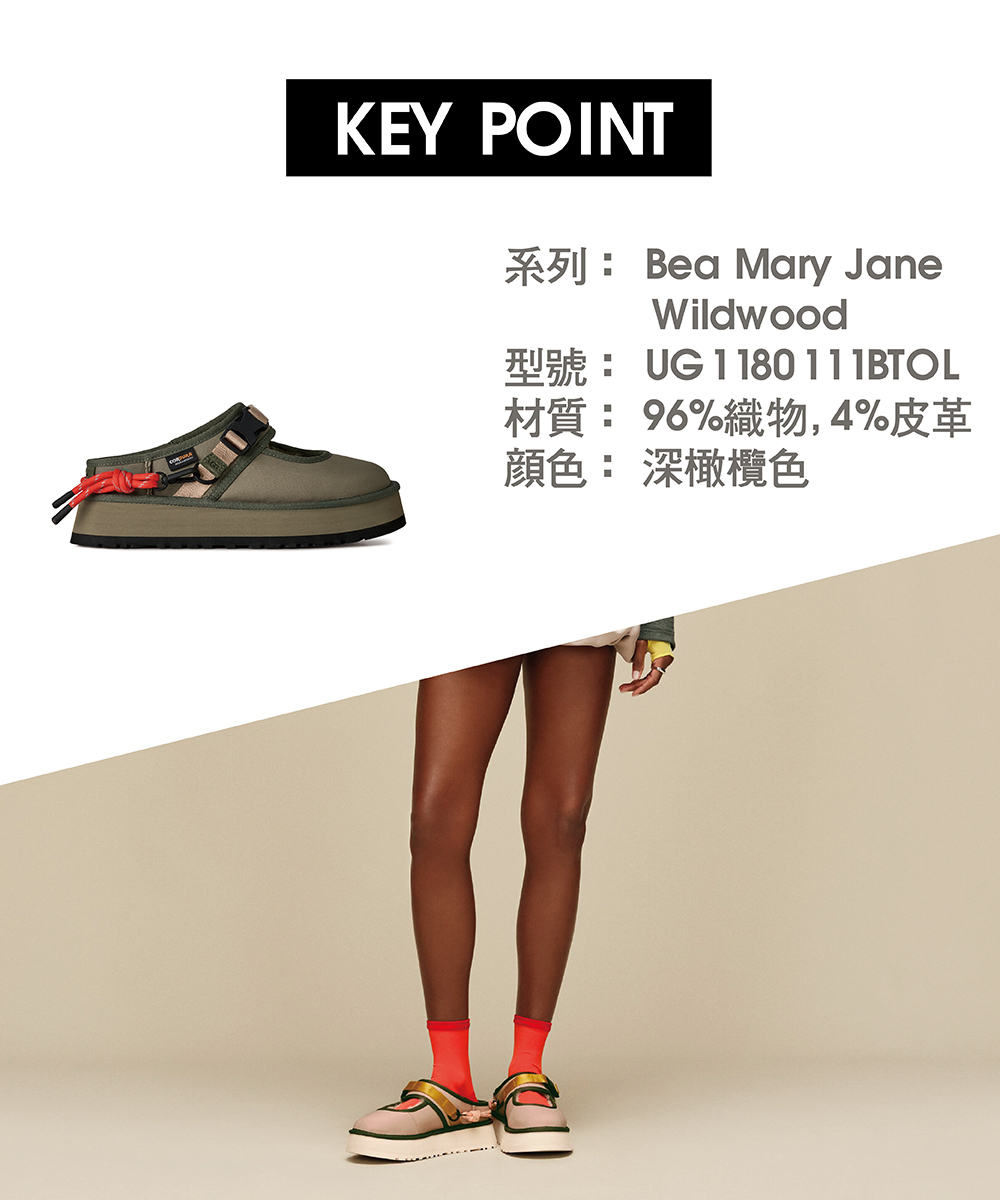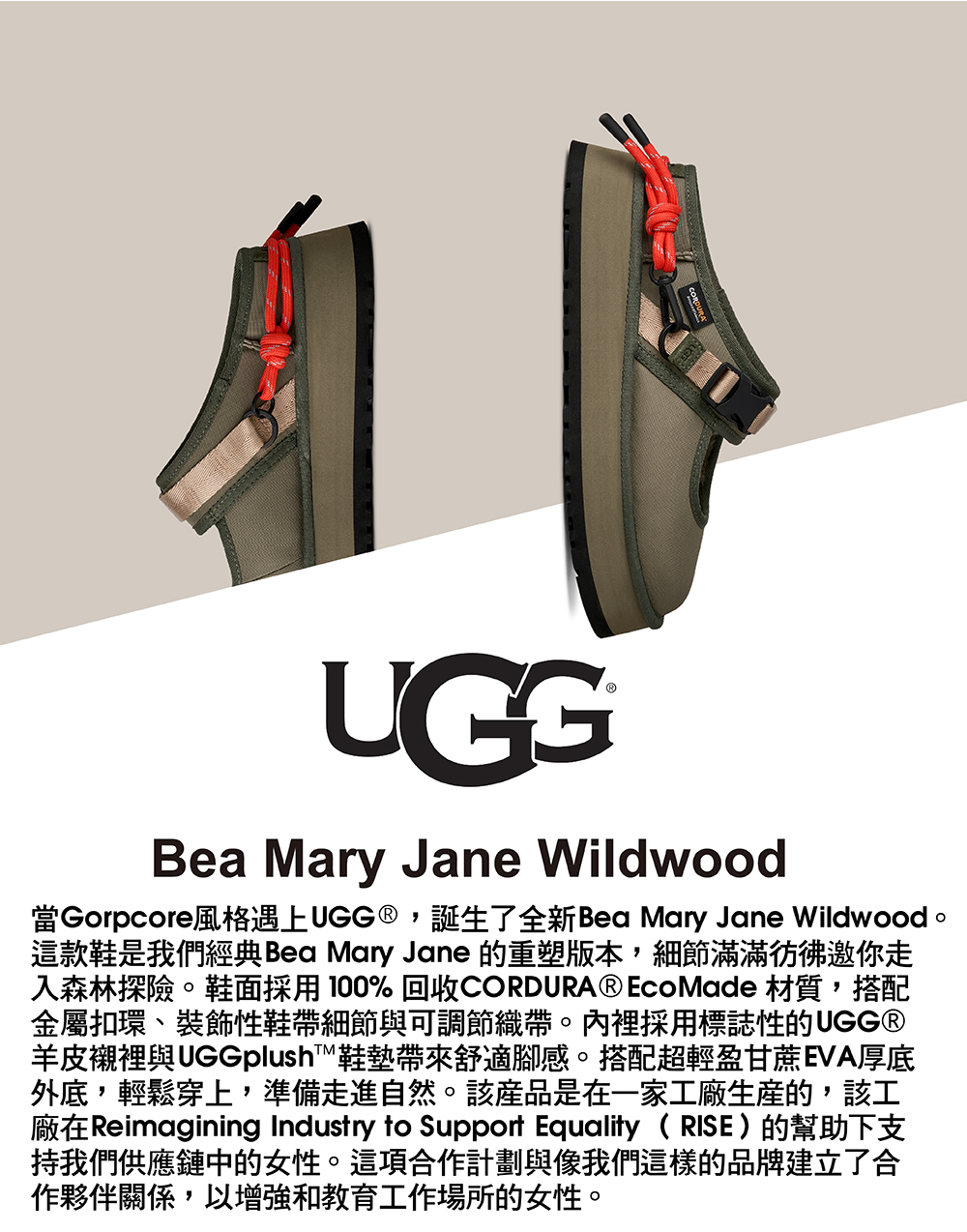 當 Gorpcore 風格遇上 UGG®,誕生了全新 Bea Mary Jane Wildwood。這款鞋是我們經典 Bea Mary Jane 的重塑版本,細節滿滿,彷彿邀你走入森林探險。鞋面採用 100% 回收 CORDURA® EcoMade 材質,搭配金屬扣環、裝飾性鞋帶細節與可調節織帶。內裡採用標誌性的 UGG® 羊皮襯裡與 UGGplush™ 鞋墊,帶來舒適腳感。搭配超輕盈甘蔗 EVA 厚底外底,輕鬆穿上,準備走進自然。該產品是在一家工廠生產的,該工廠在 Reimagining Industry to Support Equality (RISE) 的幫助下支持我們供應鏈中的女性。這項合作計劃與像我們這樣的品牌建立了合作夥伴關係,以增強和教育工作場所的女性。