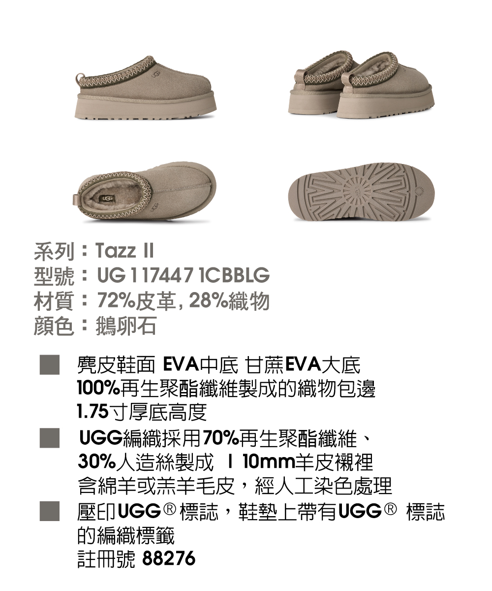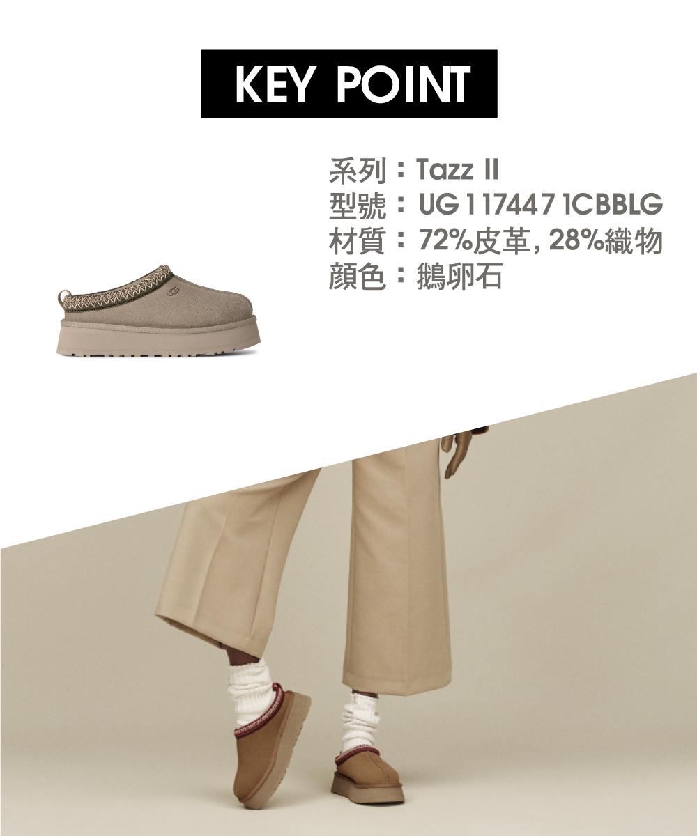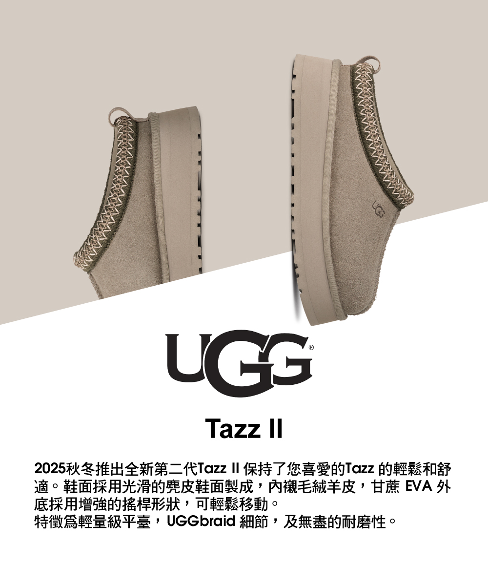 2025秋冬推出全新第二代Tazz II 保持了您喜愛的Tazz 的輕鬆和舒適。鞋面採用光滑的麂皮鞋面製成,內襯毛絨羊皮,甘蔗 EVA 外底採用增強的搖桿形狀,可輕鬆移動。特徵為輕量級平臺,UGGbraid 細節,及無盡的耐磨性。