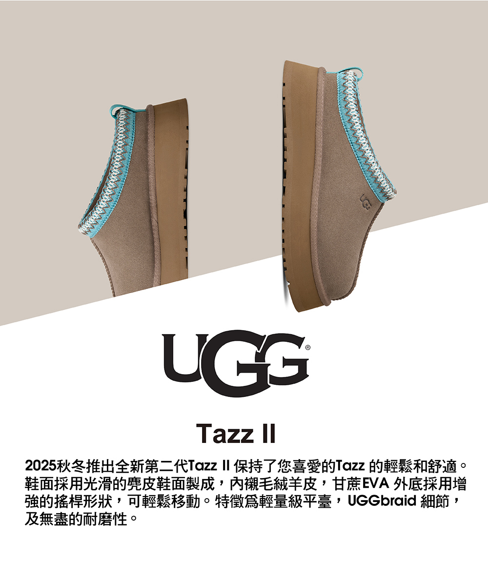 2025秋冬推出全新第二代Tazz II 保持了您喜愛的Tazz 的輕鬆和舒適。鞋面採用光滑的麂皮鞋面製成,內襯毛絨羊皮,甘蔗 EVA 外底採用增強的搖桿形狀,可輕鬆移動。特徵為輕量級平臺,UGGbraid 細節,及無盡的耐磨性。