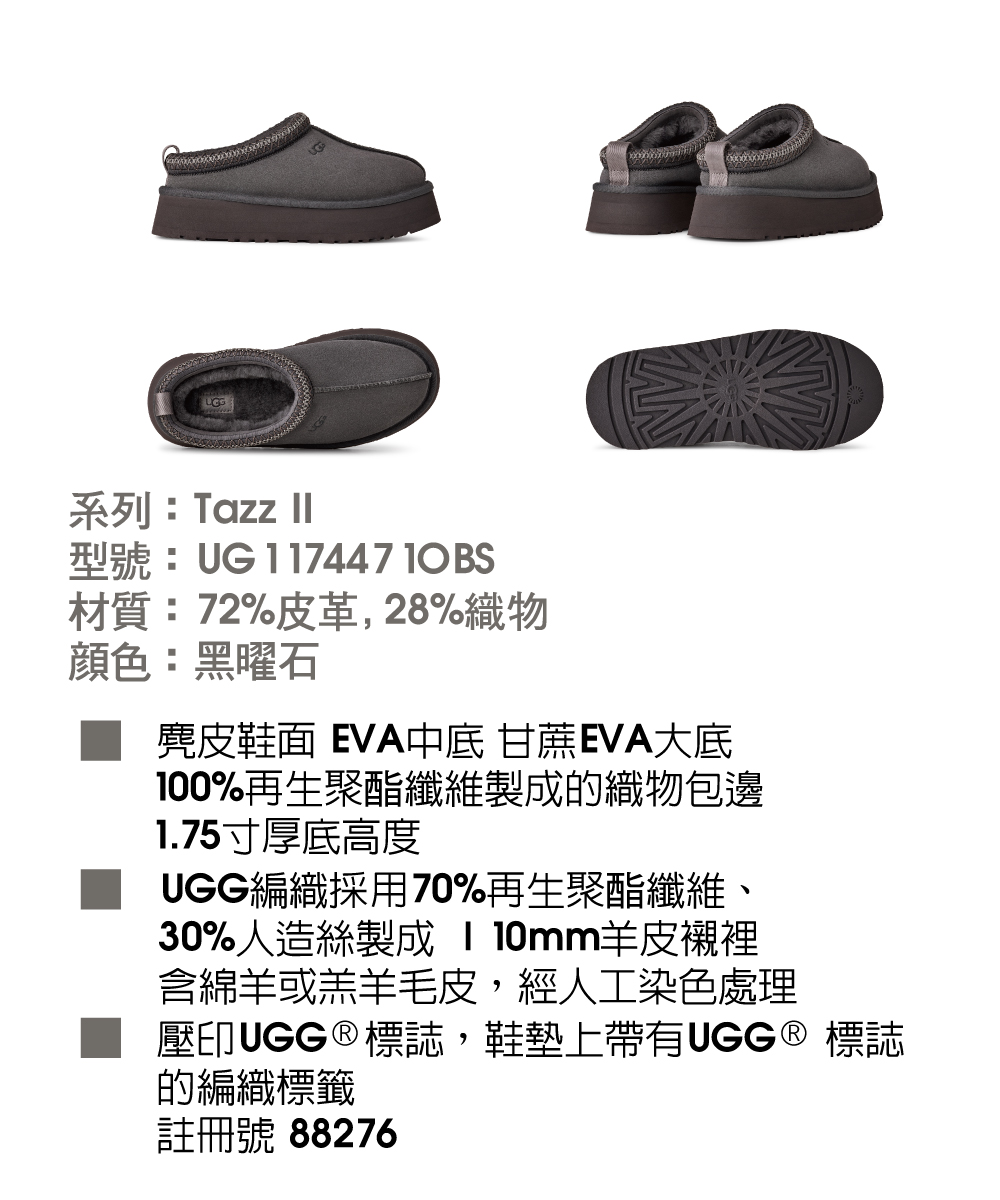 2025秋冬推出全新第二代Tazz II 保持了您喜愛的Tazz 的輕鬆和舒適。鞋面採用光滑的麂皮鞋面製成,內襯毛絨羊皮,甘蔗 EVA 外底採用增強的搖桿形狀,可輕鬆移動。特徵為輕量級平臺,UGGbraid 細節,及無盡的耐磨性。