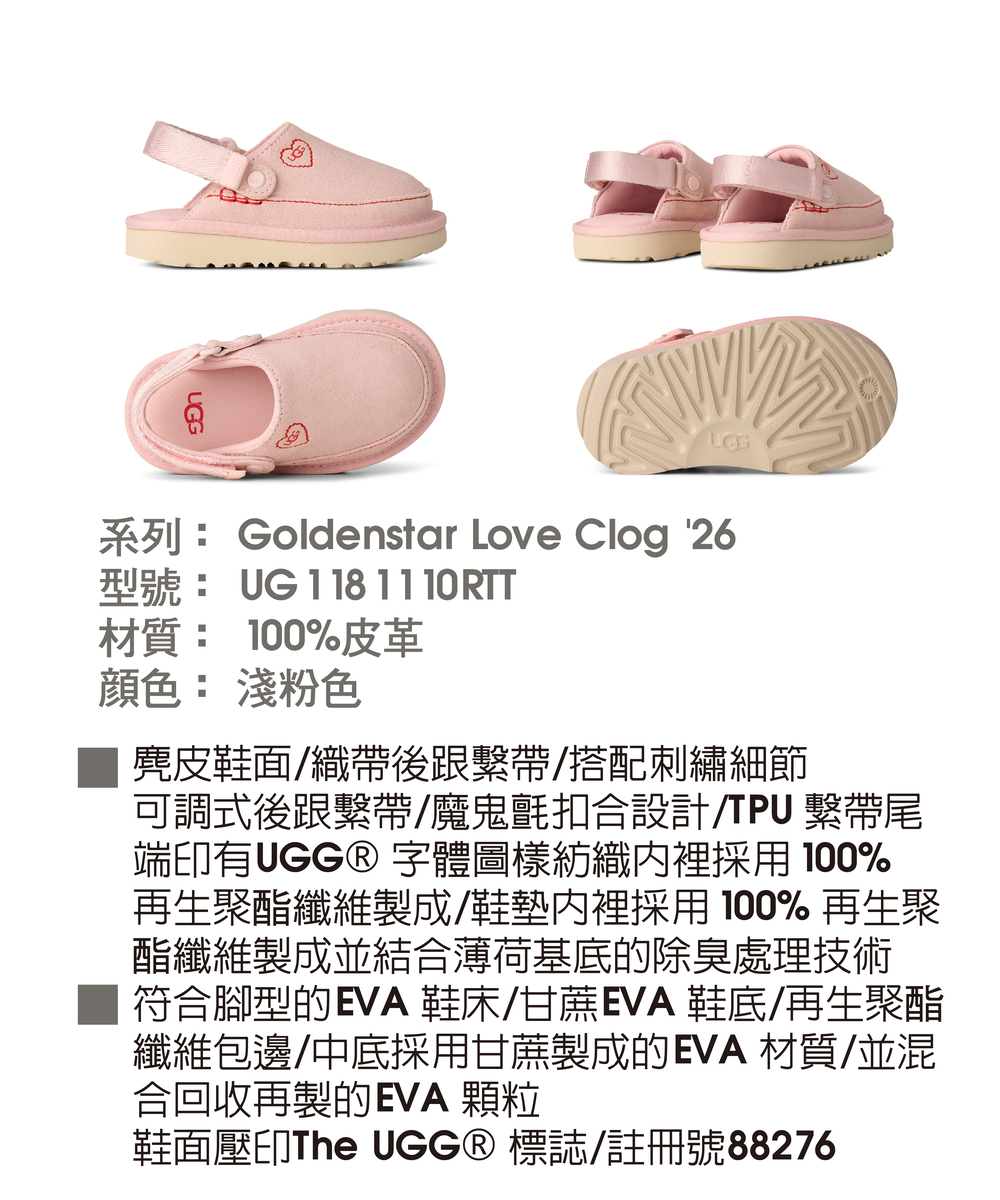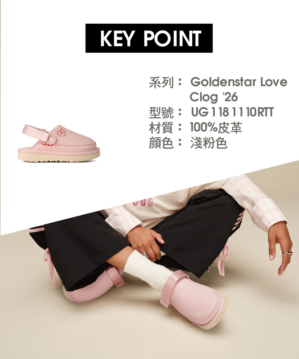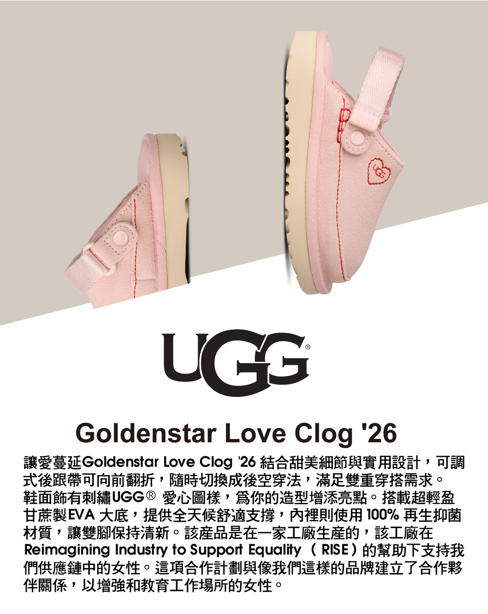 讓愛蔓延 – Goldenstar Love Clog '26 結合甜美細節與實用設計,可調式後跟帶可向前翻折,隨時切換成後空穿法,滿足雙重穿搭需求。鞋面飾有刺繡 UGG® 愛心圖樣,為你的造型增添亮點。搭載超輕盈甘蔗製 EVA 大底,提供全天候舒適支撐,內裡則使用 100% 再生抑菌材質,讓雙腳保持清新。該產品是在一家工廠生產的,該工廠在 Reimagining Industry to Support Equality (RISE) 的幫助下支持我們供應鏈中的女性。這項合作計劃與像我們這樣的品牌建立了合作夥伴關係,以增強和教育工作場所的女性。