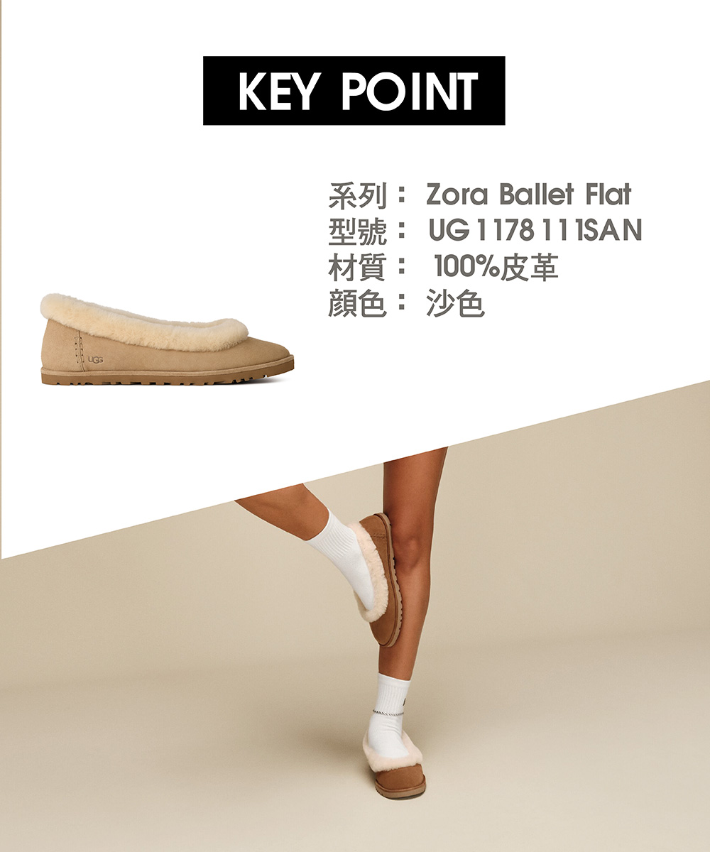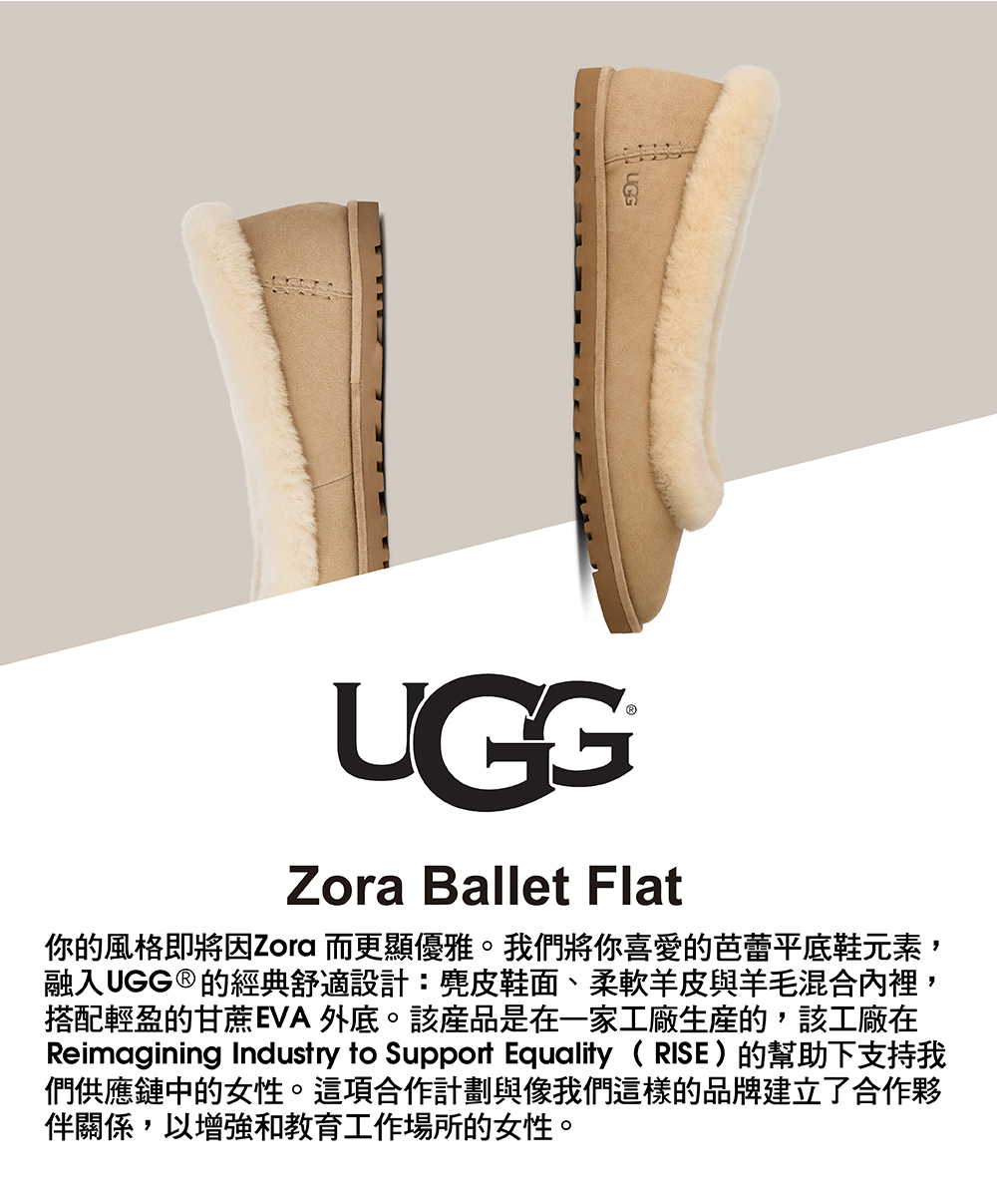 你的風格即將因 Zora 而更顯優雅。我們將你喜愛的芭蕾平底鞋元素,融入 UGG® 的經典舒適設計:麂皮鞋面、柔軟羊皮與羊毛混合內裡,搭配輕盈的甘蔗 EVA 外底。該產品是在一家工廠生產的,該工廠在 Reimagining Industry to Support Equality (RISE) 的幫助下支持我們供應鏈中的女性。這項合作計劃與像我們這樣的品牌建立了合作夥伴關係,以增強和教育工作場所的女性。